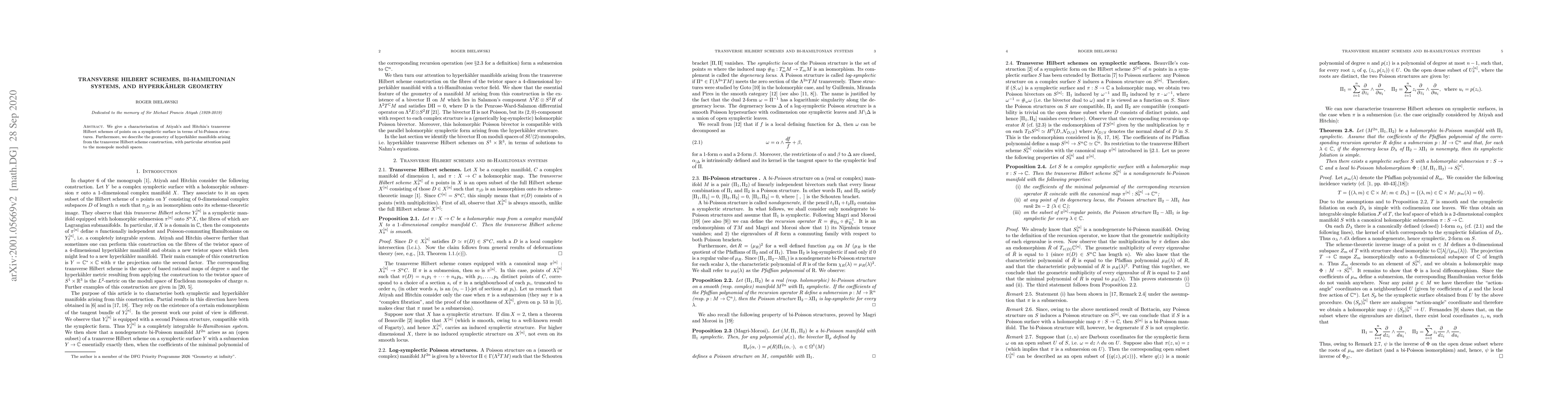 This paper characterizes Atiyah's and Hitchin's transverse Hilbert schemes via bi-Poisson structures and explores the geometry of hyperkähler manifolds derived from these schemes, focusing on monopole moduli spaces.