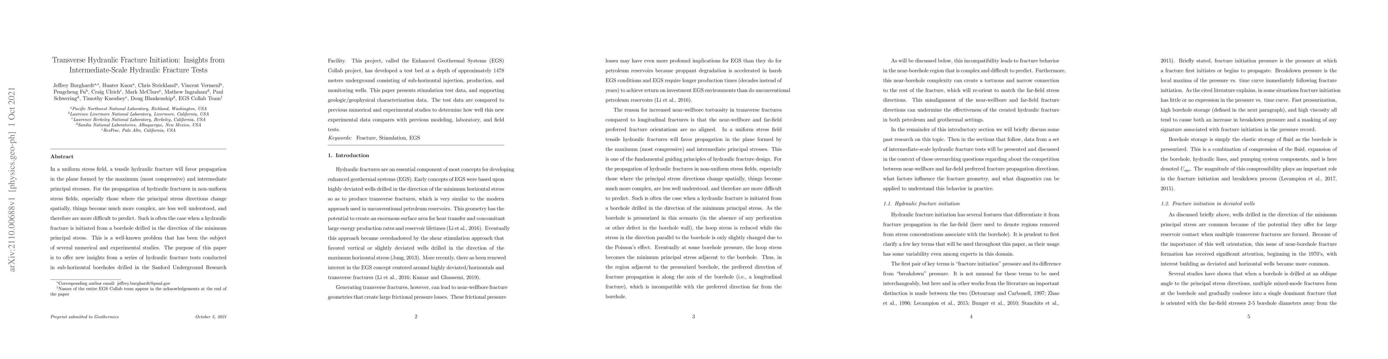 This paper presents new insights from intermediate-scale hydraulic fracture tests in sub-horizontal boreholes at the Sanford Underground Research Facility, focusing on fracture initiation and propagation in non-uniform stress fields. The results are compared with previous studies to assess the accuracy of existing models in predicting fracture behavior.