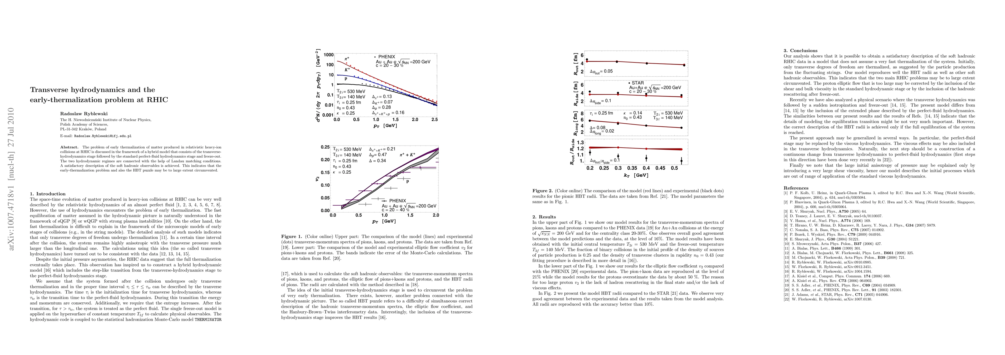 The problem of early thermalization of matter produced in relativistic heavy-ion collisions at RHIC is discussed in the framework of a hybrid model that consists of the transverse-hydrodynamics stage followed by the standard perfect-fluid hydrodynamics stage and freeze-out. The two hydrodynamic regimes are connected with the help of Landau matching conditions. A satisfactory description of the soft hadronic observables is achieved. This indicates that the early-thermalization problem and also the HBT puzzle may be to large extent circumvented.
