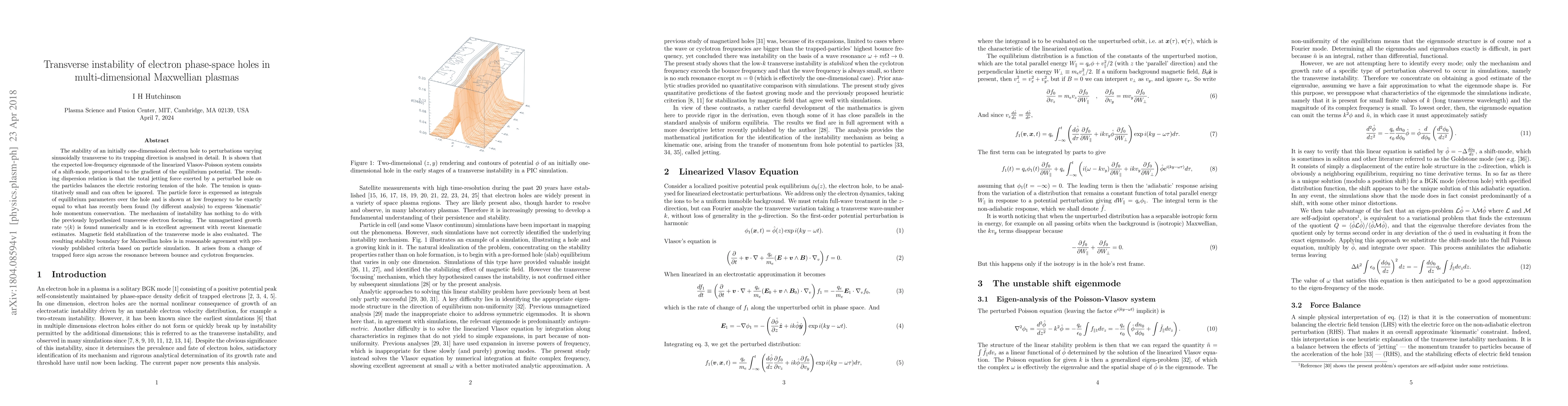 The stability of an initially one-dimensional electron hole to perturbations varying sinusoidally transverse to its trapping direction is analysed in detail. It is shown that the expected low-frequency eigenmode of the linearized Vlasov-Poisson system consists of a shift-mode, proportional to the gradient of the equilibrium potential. The resulting dispersion relation is that the total jetting force exerted by a perturbed hole on the particles balances the electric restoring tension of the hole. The tension is quantitatively small and can often be ignored. The particle force is expressed as integrals of equilibrium parameters over the hole and is shown at low frequency to be exactly equal to what has recently been found (by different analysis) to express `kinematic' hole momentum conservation. The mechanism of instability has nothing to do with the previously hypothesized transverse electron focusing. The unmagnetized growth rate $\gamma(k)$ is found numerically and is in excellent agreement with recent kinematic estimates. Magnetic field stabilization of the transverse mode is also evaluated. The resulting stability boundary for Maxwellian holes is in reasonable agreement with previously published criteria based on particle simulation. It arises from a change of trapped force sign across the resonance between bounce and cyclotron frequencies.