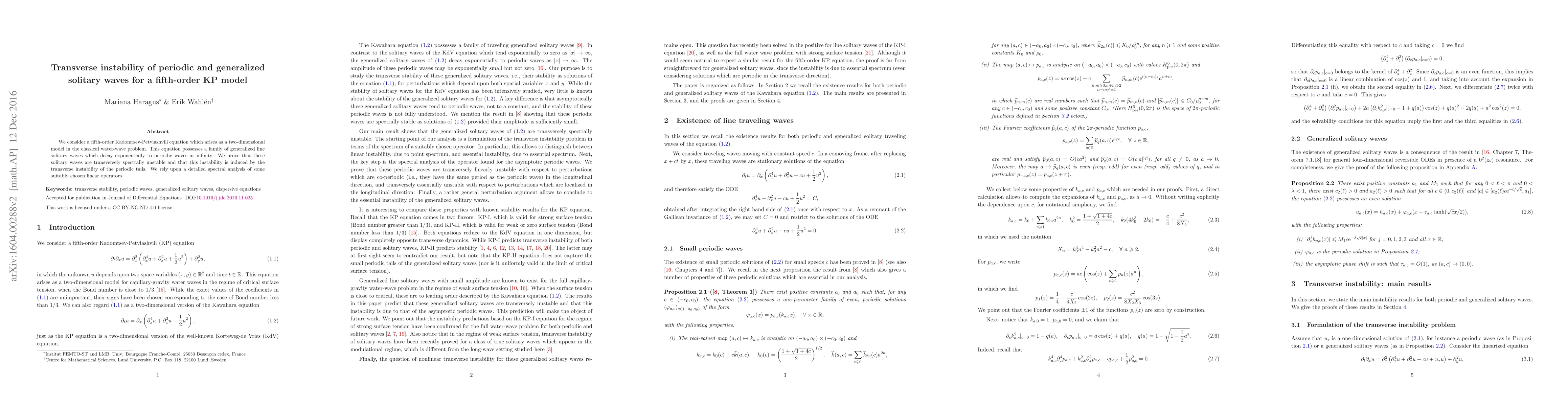 A fifth-order Kadomtsev-Petviashvili model exhibits transverse spectral instability in its periodic and generalized solitary waves, leading to their decay.