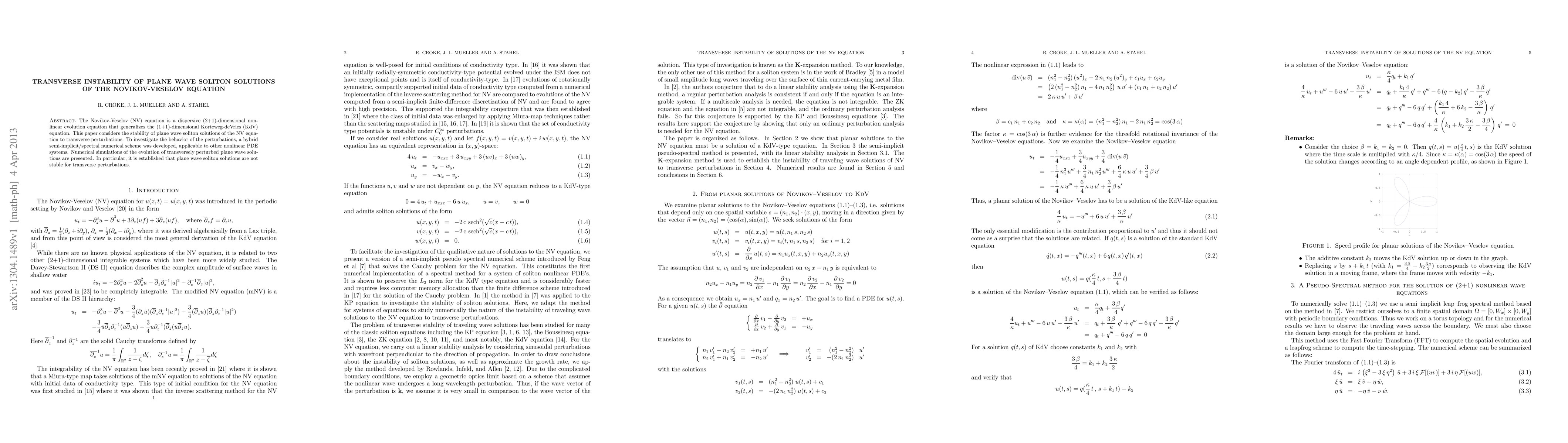 The Novikov-Veselov (NV) equation is a dispersive (2+1)-dimensional nonlinear evolution equation that generalizes the (1+1)-dimensional Korteweg-deVries (KdV) equation. This paper considers the stability of plane wave soliton solutions of the NV equation to transverse perturbations. To investigate the behavior of the perturbations, a hybrid semi-implicit/spectral numerical scheme was developed, applicable to other nonlinear PDE systems. Numerical simulations of the evolution of transversely perturbed plane wave solutions are presented. In particular, it is established that plane wave soliton solutions are not stable for transverse perturbations.