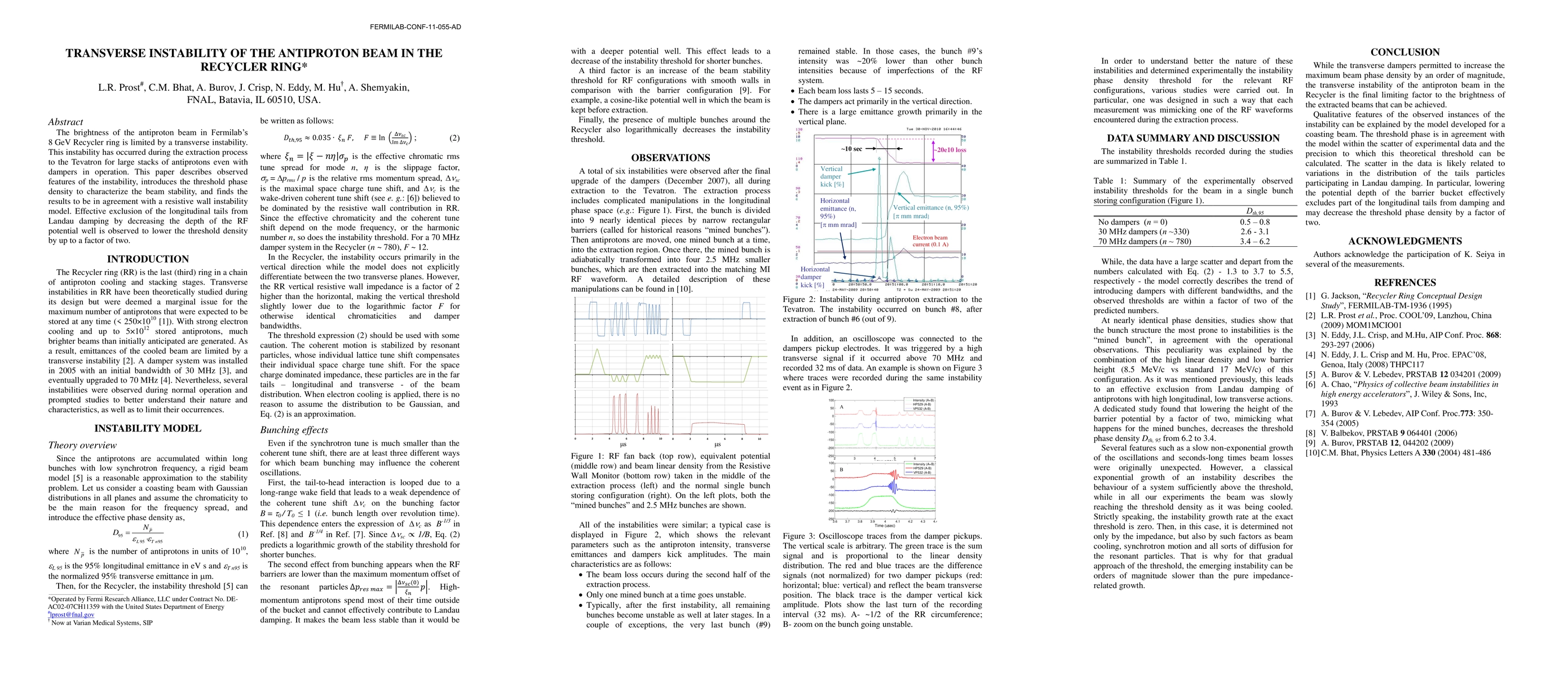 This paper investigates the transverse instability limiting the brightness of the antiproton beam in Fermilab's Recycler Ring, attributing it to a resistive wall instability model. The study finds that reducing the RF potential well depth can lower the threshold density, effectively mitigating the instability by up to a factor of two.