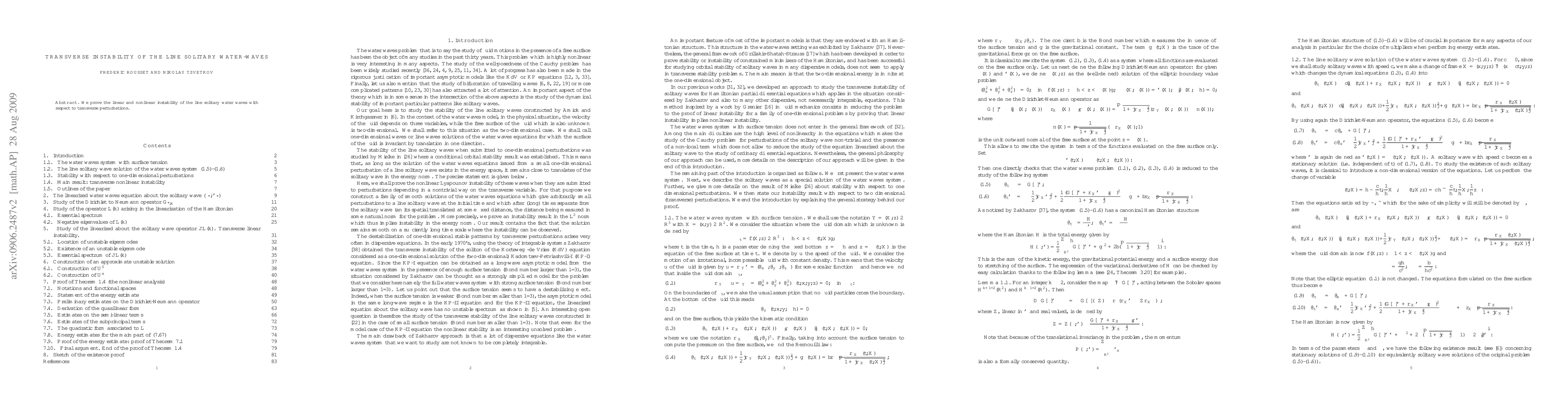 Summary: This paper demonstrates both linear and nonlinear instability of solitary water-wave lines when subjected to transverse perturbations, providing a comprehensive analysis of their stability.