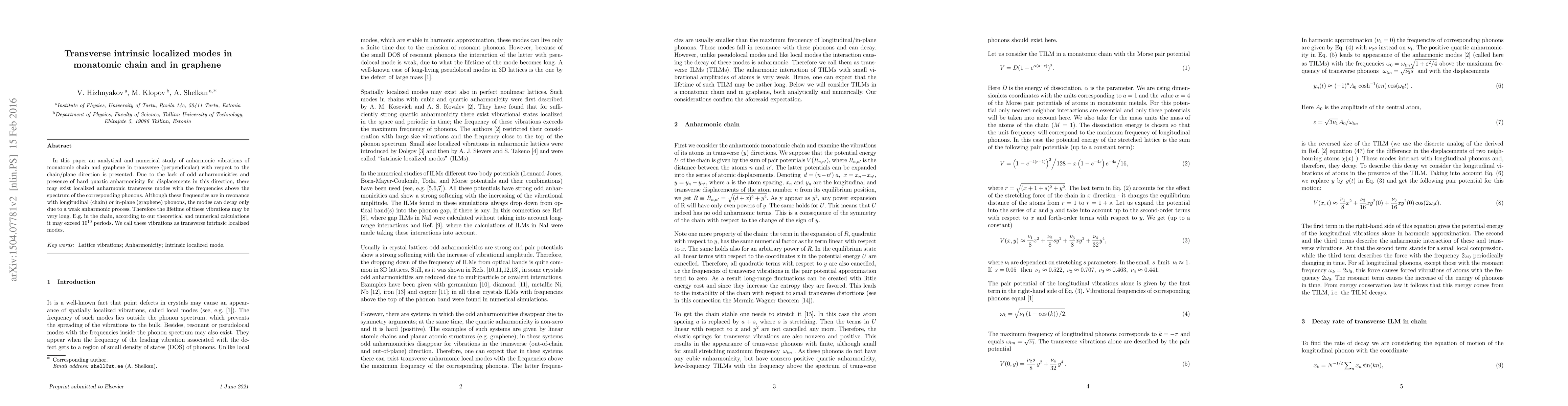 This paper investigates anharmonic transverse vibrations in monatomic chains and graphene, revealing the existence of long-lived localized modes called transverse intrinsic localized modes, which decay slowly due to weak anharmonic processes. Theoretical and numerical studies show these modes can persist for over 10^10 periods.