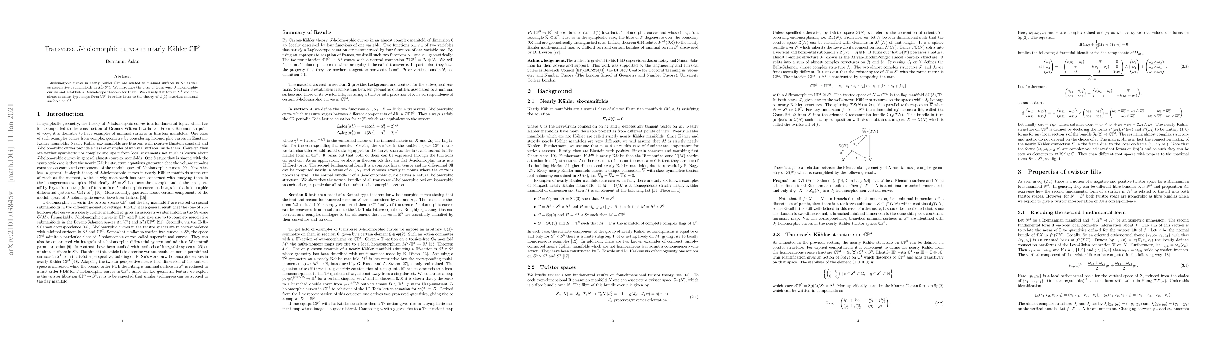 This paper investigates transverse $J$-holomorphic curves in nearly Kähler $\mathbb{CP}^3$, establishing a Bonnet-type theorem and classifying flat tori in $S^4$, with a construction of moment-type maps to link these to $\mathrm{U}(1)$-invariant minimal surfaces in $S^4.