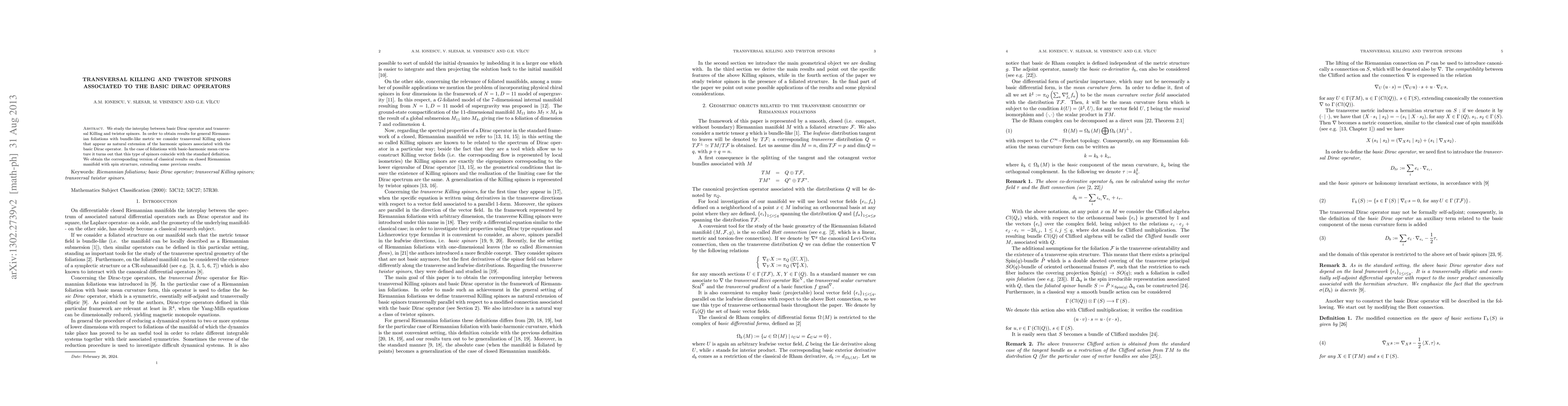 Summary: This paper investigates the relationship between basic Dirac operators and transverse Killing and twistor spinors, extending harmonic spinors for general Riemannian foliations, and demonstrating that these coincide in specific cases, yielding classical results on closed Riemannian manifolds with spin structures.