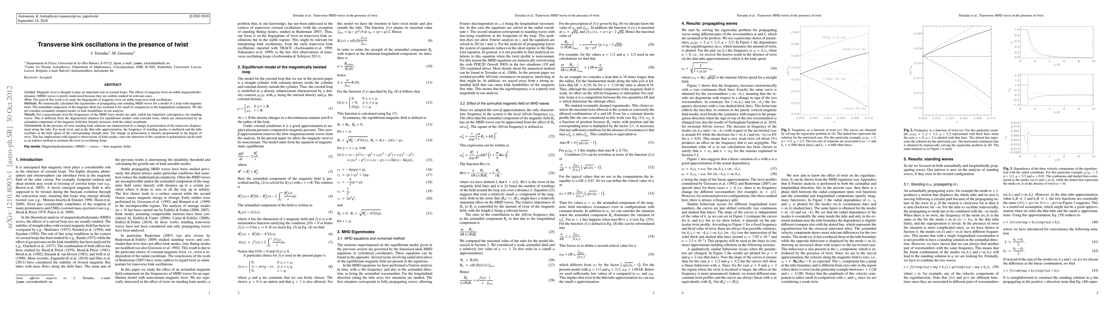 Magnetic twist is thought to play an important role in coronal loops. The effects of magnetic twist on stable magnetohydrodynamic (MHD) waves is poorly understood because they are seldom studied for relevant cases. The goal of this work is to study the fingerprints of magnetic twist on stable transverse kink oscillations. We numerically calculated the eigenmodes of propagating and standing MHD waves for a model of a loop with magnetic twist. The azimuthal component of the magnetic field was assumed to be small in comparison to the longitudinal component. We did not consider resonantly damped modes or kink instabilities in our analysis. For a nonconstant twist the frequencies of the MHD wave modes are split, which has important consequences for standing waves. This is different from the degenerated situation for equilibrium models with constant twist, which are characterised by an azimuthal component of the magnetic field that linearly increases with the radial coordinate. In the presence of twist standing kink solutions are characterised by a change in polarisation of the transverse displacement along the tube. For weak twist, and in the thin tube approximation, the frequency of standing modes is unaltered and the tube oscillates at the kink speed of the corresponding straight tube. The change in polarisation is linearly proportional to the degree of twist. This has implications with regard to observations of kink modes, since the detection of this variation in polarisation can be used as an indirect method to estimate the twist in oscillating loops.