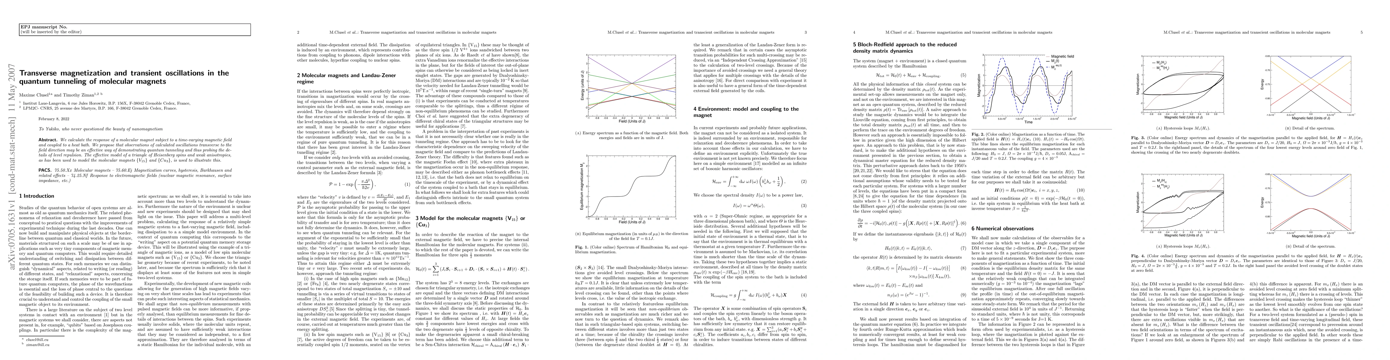 We calculate the response of a molecular magnet subject to a time-varying magnetic field and coupled to a heat bath. We propose that observations of calculated oscillations transverse to the field direction may be an effective way of demonstrating quantum tunneling and thus probing the details of level repulsion. The effective model of a triangle of Heisenberg spins and weak anisotropies, as has been used to model the molecular magnets V15 and Cu3, is used to illustrate this.