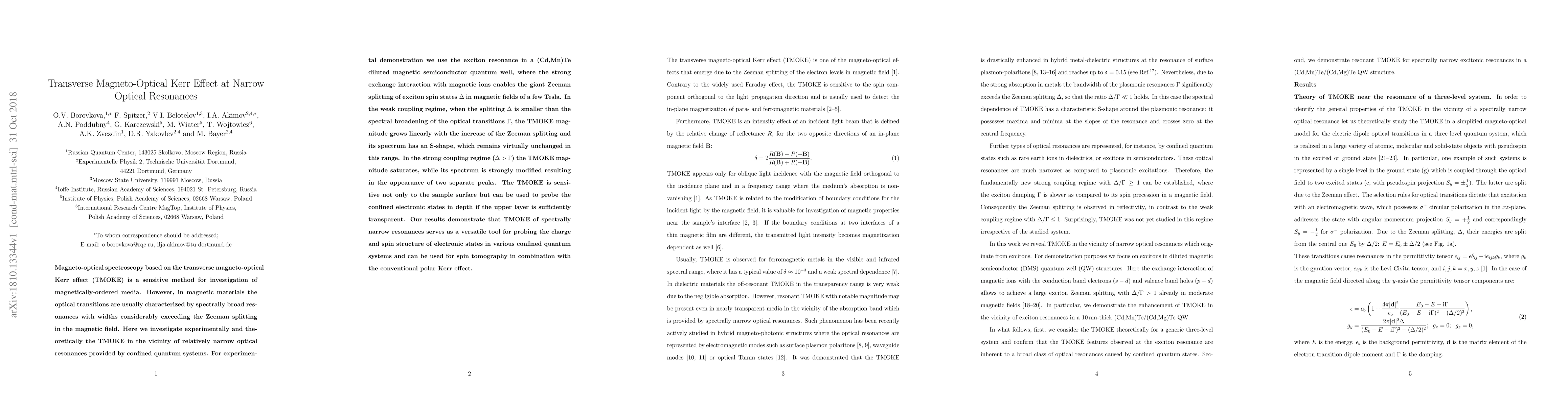 Magneto-optical spectroscopy based on the transverse magneto-optical Kerr effect (TMOKE) is a sensitive method for investigation of magnetically-ordered media. However, in magnetic materials the optical transitions are usually characterized by spectrally broad resonances with widths considerably exceeding the Zeeman splitting in the magnetic field. Here we investigate experimentally and theoretically the TMOKE in the vicinity of relatively narrow optical resonances provided by confined quantum systems. For experimental demonstration we use the exciton resonance in a (Cd,Mn)Te diluted magnetic semiconductor quantum well, where the strong exchange interaction with magnetic ions enables the giant Zeeman splitting of exciton spin states $\Delta$ in magnetic fields of a few Tesla. In the weak coupling regime, when the splitting $\Delta$ is smaller than the spectral broadening of the optical transitions $\Gamma$, the TMOKE magnitude grows linearly with the increase of the Zeeman splitting and its spectrum has an S-shape, which remains virtually unchanged in this range. In the strong coupling regime ($\Delta>\Gamma$) the TMOKE magnitude saturates, while its spectrum is strongly modified resulting in the appearance of two separate peaks. The TMOKE is sensitive not only to the sample surface but can be used to probe the confined electronic states in depth if the upper layer is sufficiently transparent. Our results demonstrate that TMOKE of spectrally narrow resonances serves as a versatile tool for probing the charge and spin structure of electronic states in various confined quantum systems and can be used for spin tomography in combination with the conventional polar Kerr effect.