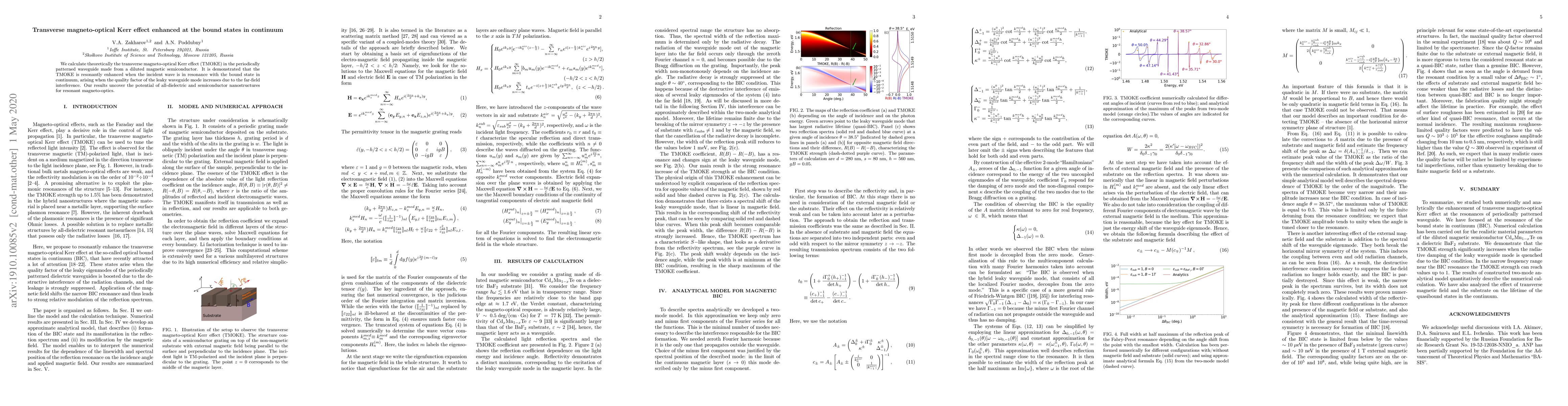 We calculate theoretically the transverse magneto-optical Kerr effect (TMOKE) in the periodically patterned waveguide made from a diluted magnetic semiconductor. It is demonstrated that the TMOKE is resonantly enhanced when the incident wave is in resonance with the bound state in continuum, arising when the quality factor of the waveguide mode increases due to the far-field interference. Our results uncover the potential of all-dielectric and semiconductor nanostructures for resonant magneto-optics.