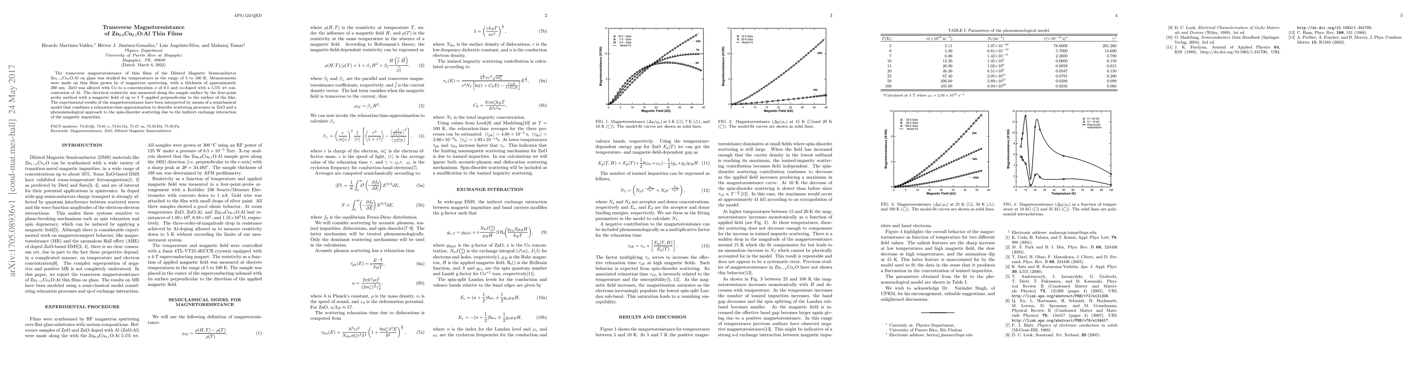 The transverse magnetoresistance of thin films of the Diluted Magnetic Semiconductor Zn$_{1-x}$Co$_{x}$O:Al on glass was studied for temperatures in the range of 5 to 100 K. Measurements were made on thin films grown by rf magnetron sputtering, with a thickness of approximately 200 nm. ZnO was alloyed with Co to a concentration $x$ of 0.1 and co-doped with a 5.5% wt concentration of Al. The electrical resistivity was measured along the sample surface by the four-point probe method with a magnetic field of up to 4 T applied perpendicular to the surface of the film. The experimental results of the magnetoresistance have been interpreted by means of a semiclassical model that combines a relaxation-time approximation to describe scattering processes in ZnO and a phenomenological approach to the spin-disorder scattering due to the indirect exchange interaction of the magnetic impurities.