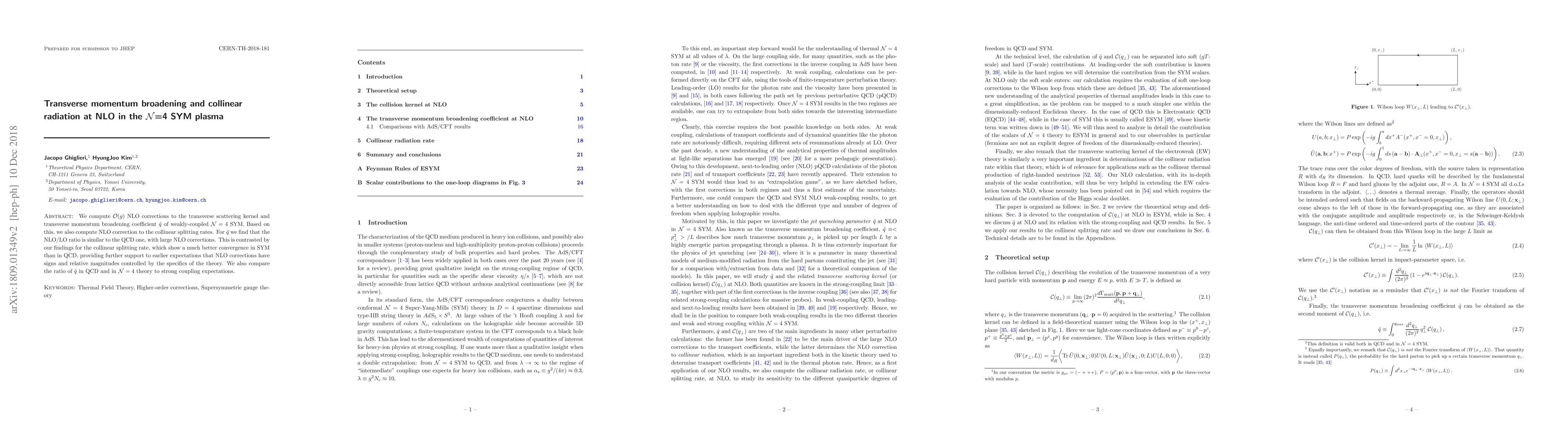This paper computes O(g) next-to-leading order (NLO) corrections to the transverse scattering kernel and momentum broadening coefficient in $\mathcal{N}=4$ SYM, finding large NLO corrections similar to QCD. It also shows better convergence for collinear splitting rates in SYM compared to QCD, indicating theory-specific NLO behavior.