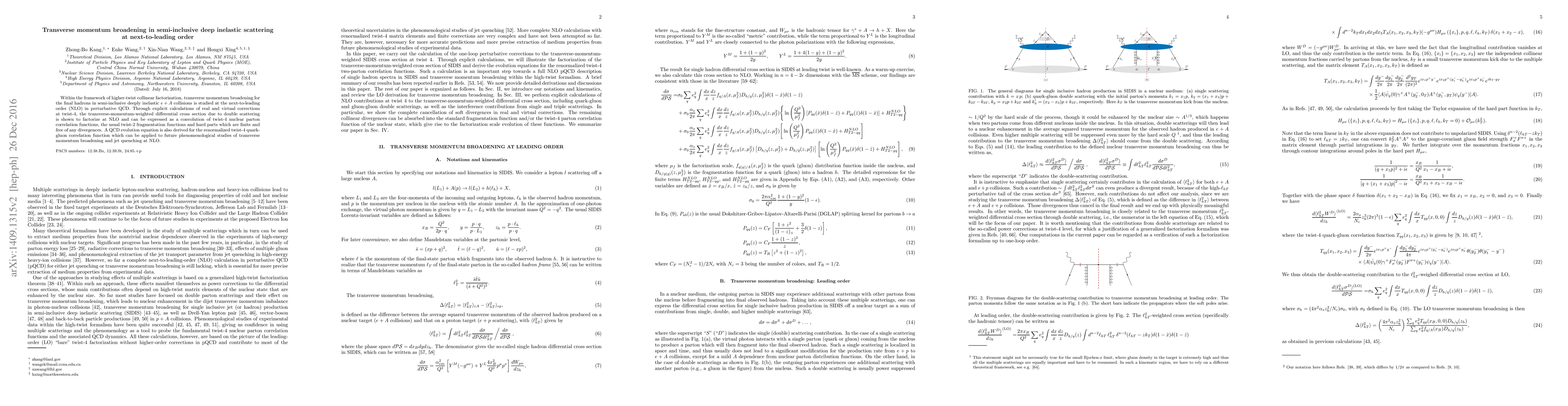 This paper investigates transverse momentum broadening in semi-inclusive deep inelastic scattering at next-to-leading order (NLO) within higher-twist collinear factorization. It demonstrates factorization of the transverse-momentum-weighted differential cross section due to double scattering and derives a QCD evolution equation for twist-4 quark-gluon correlation functions.