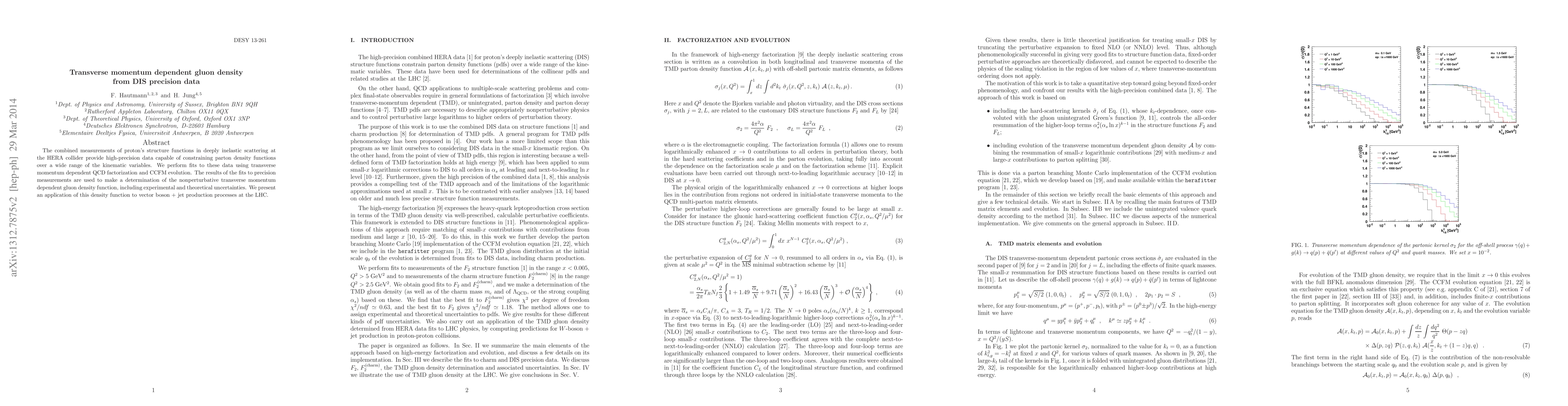 The combined measurements of proton's structure functions in deeply inelastic scattering at the HERA collider provide high-precision data capable of constraining parton density functions over a wide range of the kinematic variables. We perform fits to these data using transverse momentum dependent QCD factorization and CCFM evolution. The results of the fits to precision measurements are used to make a determination of the nonperturbative transverse momentum dependent gluon density function, including experimental and theoretical uncertainties. We present an application of this density function to vector boson + jet production processes at the LHC.