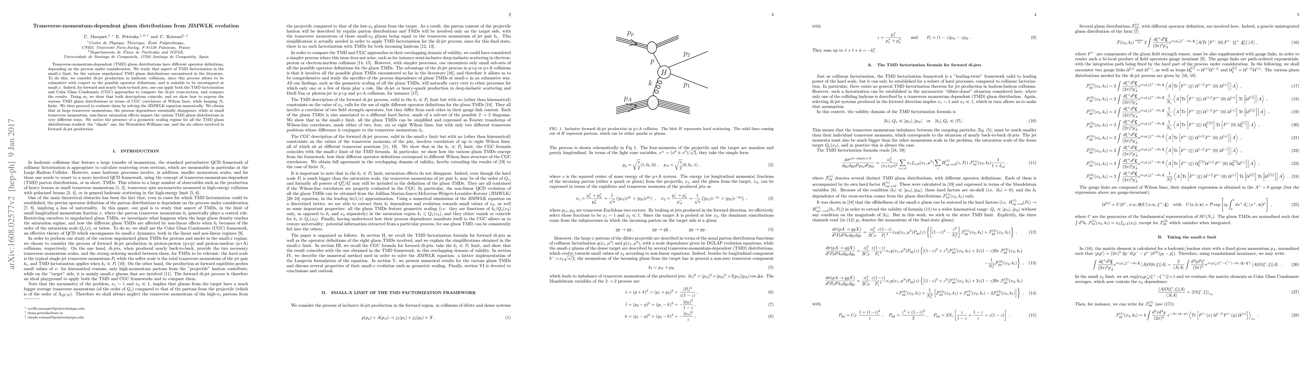 This paper investigates transverse-momentum-dependent gluon distributions in the small-x limit using JIMWLK evolution. It demonstrates that TMD factorization and Color Glass Condensate approaches yield consistent results for di-jet production, revealing a geometric scaling regime for various TMD gluon distributions.