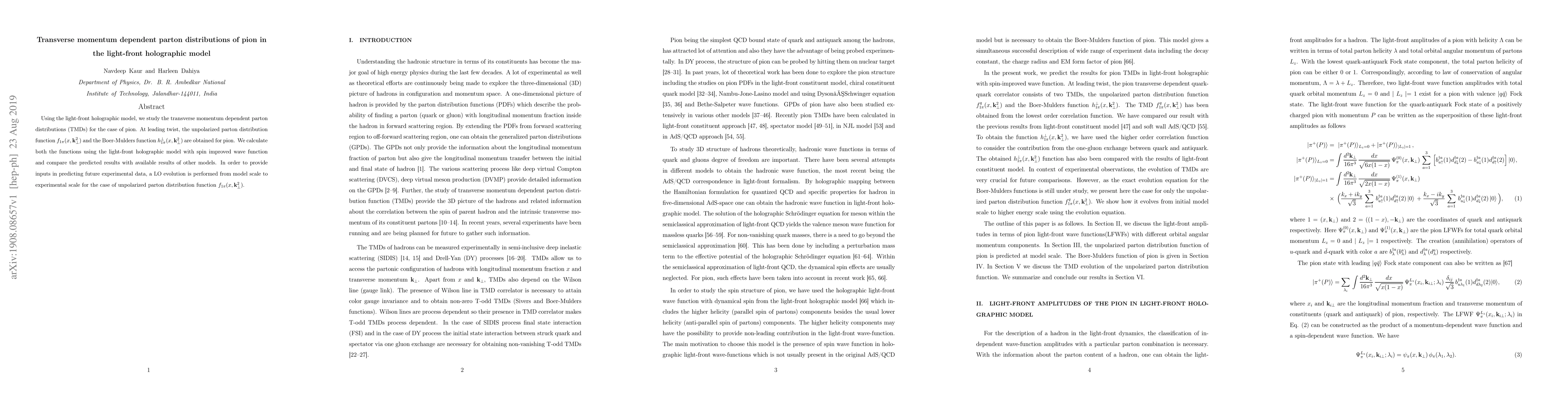 Using the light-front holographic model, we study the transverse momentum dependent parton distributions (TMDs) for the case of pion. At leading twist, the unpolarized parton distribution function $ f_{1\pi}(x,\bfk^{2}) $ and the Boer-Mulders function $ h_{1\pi}^{\bot}(x,\bfk^{2}) $ are obtained for pion. We calculate both the functions using the light-front holographic model with spin improved wave function and compare the predicted results with available results of other models. In order to provide inputs in predicting future experimental data, a LO evolution is performed from model scale to experimental scale for the case of unpolarized parton distribution function $ f_{1\pi}(x,\bfk^{2}) $.