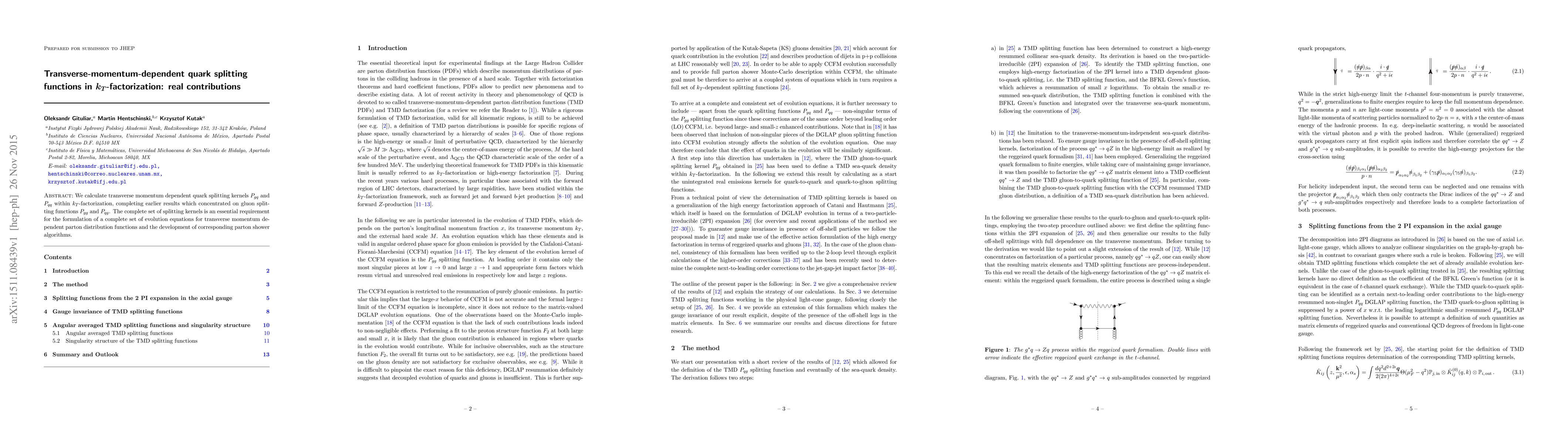 We calculate transverse momentum dependent quark splitting kernels $P_{gq}$ and $P_{qq}$ within $k_T$-factorization, completing earlier results which concentrated on gluon splitting functions $P_{gg}$ and $P_{qg}$. The complete set of splitting kernels is an essential requirement for the formulation of a complete set of evolution equations for transverse momentum dependent parton distribution functions and the development of corresponding parton shower algorithms.