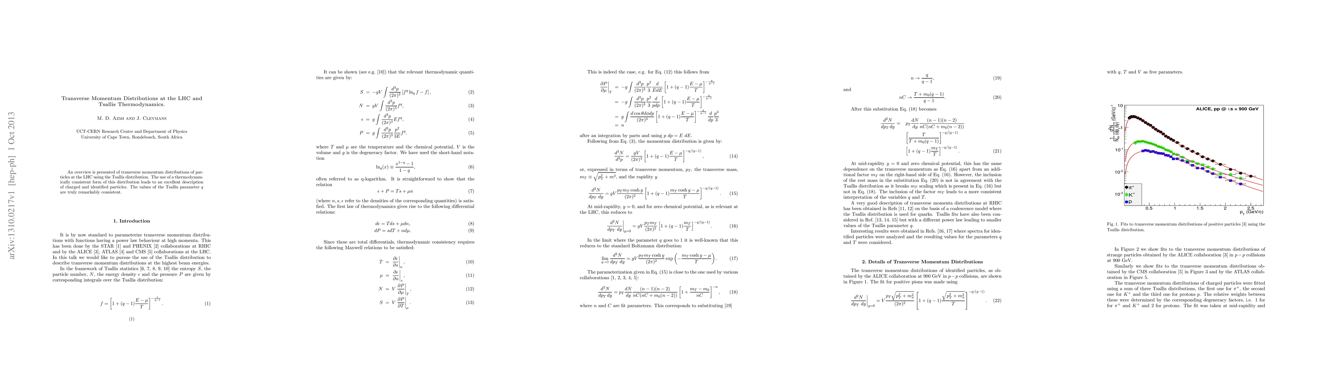 This paper reviews transverse momentum distributions of particles at the LHC using Tsallis thermodynamics, demonstrating a strong fit for both charged and identified particles, with consistent values of the Tsallis parameter q.