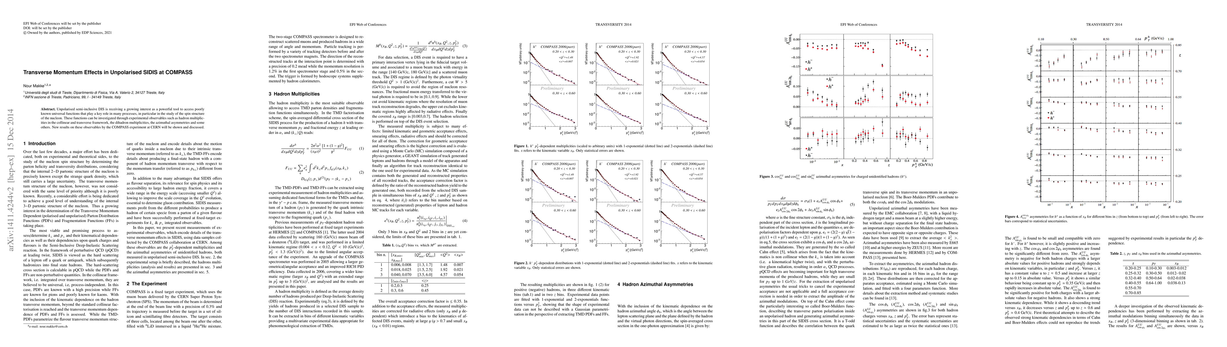 This paper presents new results from the COMPASS experiment on unpolarised semi-inclusive deep inelastic scattering (SIDIS), focusing on transverse momentum effects to explore poorly known universal functions crucial for understanding the spin structure of the nucleon. The study discusses experimental observables including hadron multiplicities and azimuthal asymmetries.