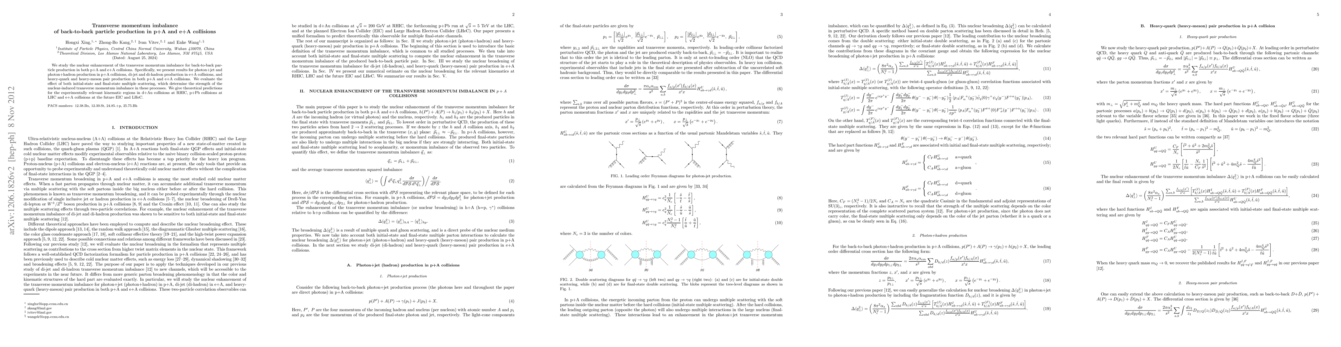 This paper investigates the nuclear enhancement of transverse momentum imbalance in back-to-back particle pairs from p+A and e+A collisions, focusing on photon+jet, photon+hadron, di-jet, and di-hadron production. It evaluates the impact of initial-state and final-state multiple scattering to predict the imbalance strength in various collision scenarios.