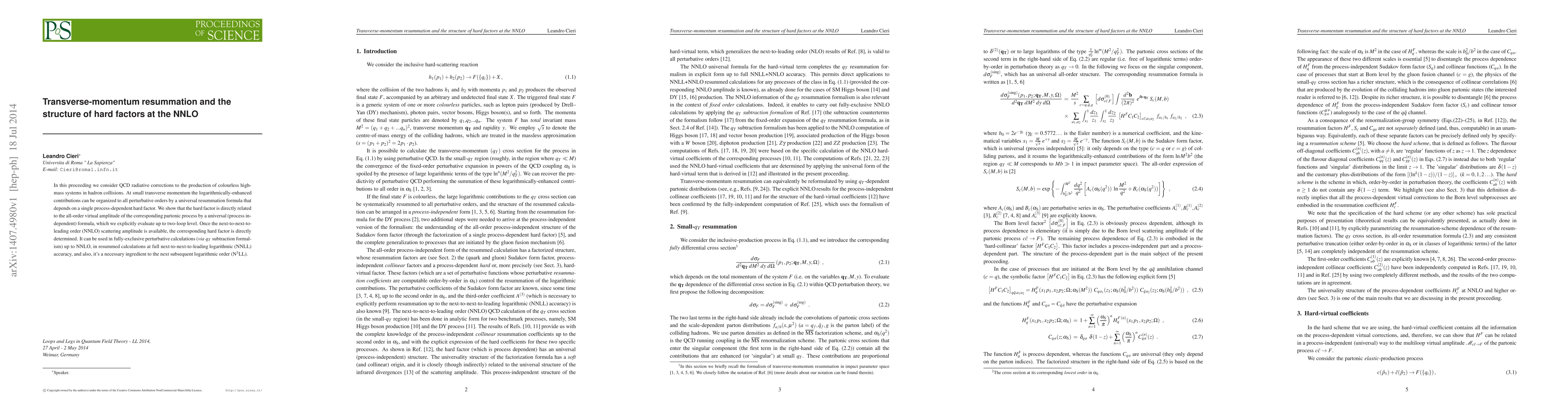 In this proceeding we consider QCD radiative corrections to the production of colourless high-mass systems in hadron collisions. At small transverse momentum the logarithmically-enhanced contributions can be organized to all perturbative orders by a universal resummation formula that depends on a single process-dependent hard factor. We show that the hard factor is directly related to the all-order virtual amplitude of the corresponding partonic process by a universal (process independent) formula, which we explicitly evaluate up to two-loop level. Once the next-to-next-to-leading order (NNLO) scattering amplitude is available, the corresponding hard factor is directly determined. It can be used in fully-exclusive perturbative calculations (via q$_T$ subtraction formalism) up to NNLO, in resummed calculations at full next-to-next-to-leading logarithmic (NNLL) accuracy, and also, it's a necessary ingredient to the next subsequent logarithmic order (N$^3$LL).
