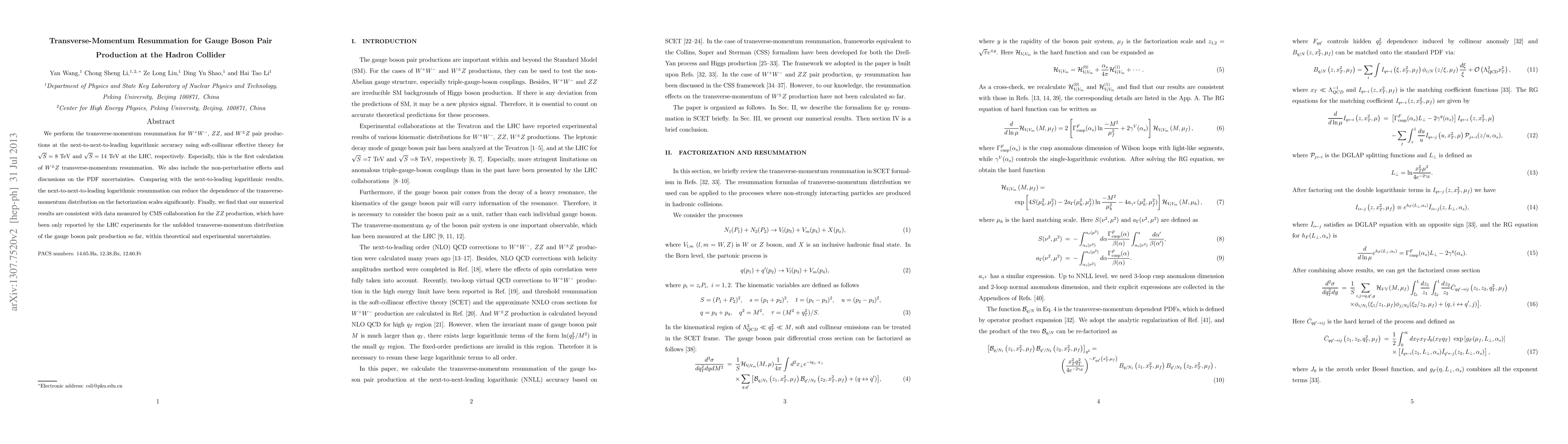 This paper presents the first transverse-momentum resummation for $W^{\pm}Z$ pair production at next-to-next-to-leading logarithmic accuracy using soft-collinear effective theory at LHC energies. The results show reduced dependence on factorization scales and are consistent with CMS data for $ZZ$ production.