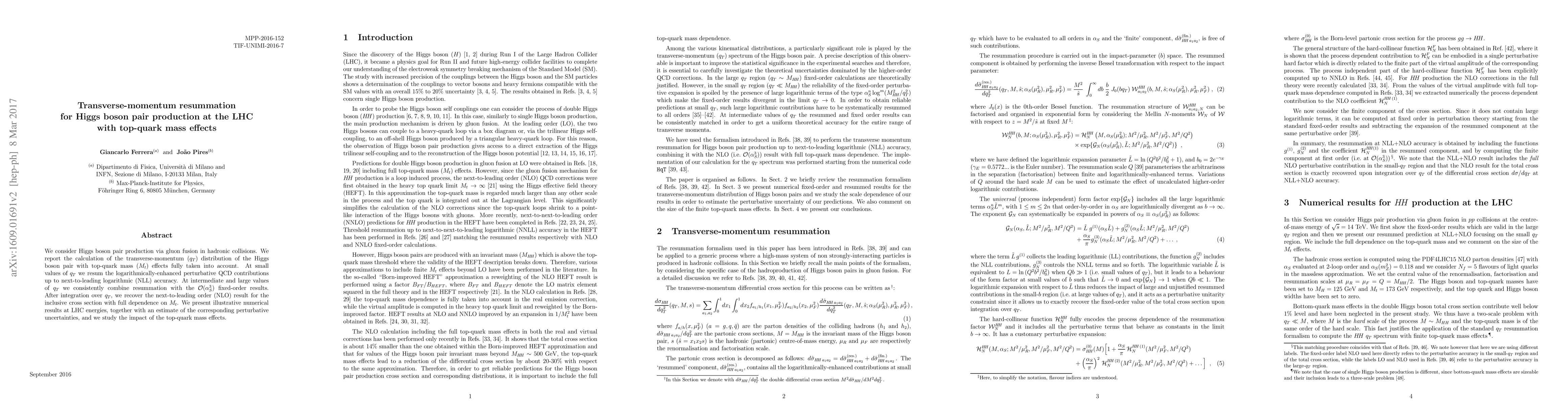 This paper calculates the transverse-momentum distribution for Higgs boson pair production via gluon fusion, incorporating resummation of logarithmically-enhanced perturbative QCD contributions up to NLL accuracy and combining it with ${\cal O}(\alpha_S^3)$ fixed-order results. It also assesses the impact of top-quark mass effects on the production process at LHC energies.