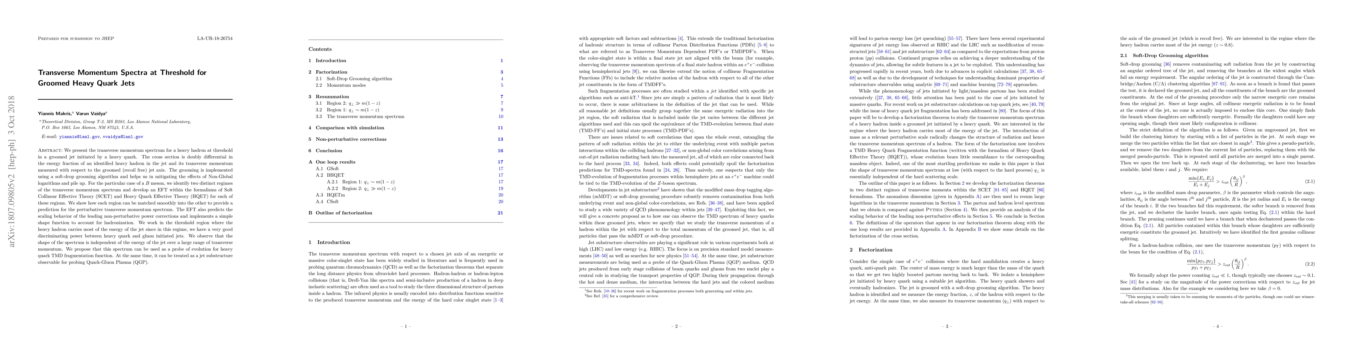 This paper investigates the transverse momentum spectrum for heavy hadrons at threshold in groomed heavy quark jets, employing a soft-drop grooming algorithm to mitigate Non-Global logarithms and pile up. It identifies two distinct transverse momentum regimes for $B$ mesons and develops an Effective Field Theory (EFT) using Soft-Collinear Effective Theory (SCET) and Heavy Quark Effective Theory (HQET) to predict the spectrum and non-perturbative corrections.
