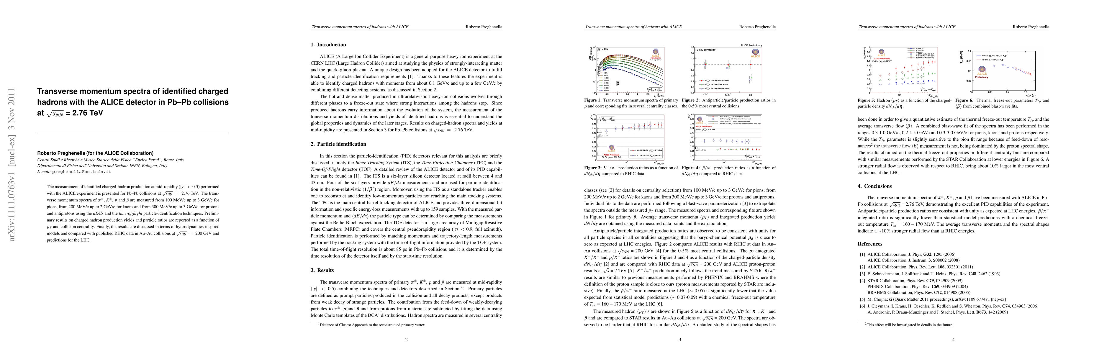 The measurement of identified charged-hadron production at mid-rapidity ($|y| < 0.5$) performed with the ALICE experiment is presented for Pb--Pb collisions at $\sqrt{s_{\rm NN}} = \rm .76 TeV$. The transverse momentum spectra of $\pi^{\pm}$, $K^{\pm}$, $p$ and $\bar{p}$ are measured from 100 MeV/c up to 3 GeV/c for pions, from 200 MeV/c up to 2 GeV/c for kaons and from 300 MeV/c up to 3 GeV/c for protons and antiprotons using the \emph{dE/dx} and the \emph{time-of-flight} particle-identification techniques. Preliminary results on charged hadron production yields and particle ratios are reported as a function of $p_{T}$ and collision centrality. Finally, the results are discussed in terms of hydrodynamics-inspired models and compared with published RHIC data in Au--Au collisions at $\sqrt{s_{\rm NN}} = \rm 200 GeV$ and predictions for the LHC.