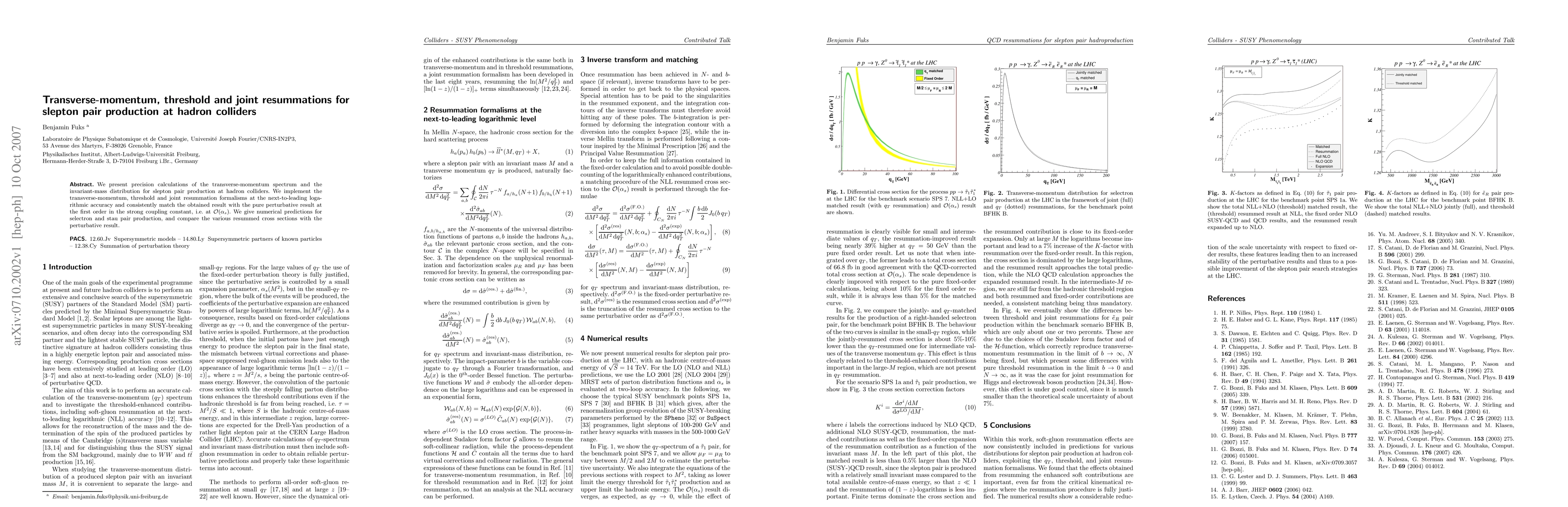 This paper provides precision calculations for the transverse-momentum spectrum and invariant-mass distribution of slepton pair production at hadron colliders using advanced resummation techniques. It matches these results with perturbative calculations at the first order in the strong coupling constant, offering numerical predictions for selectron and stau pair production.