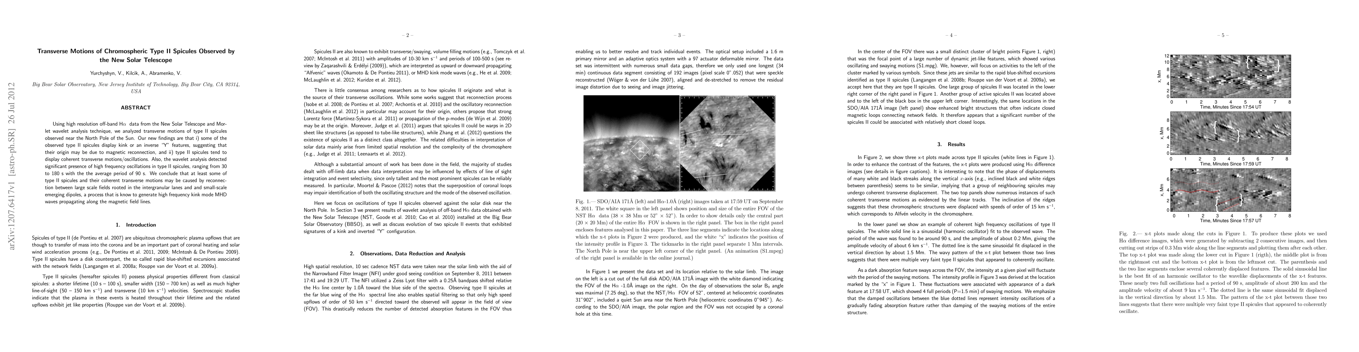 Using high resolution off-band \ha\ data from the New Solar Telescope and Morlet wavelet analysis technique, we analyzed transverse motions of type II spicules observed near the North Pole of the Sun. Our new findings are that i) some of the observed type II spicules display kink or an inverse "Y" features, suggesting that their origin may be due to magnetic reconnection, and ii) type II spicules tend to display coherent transverse motions/oscillations. Also, the wavelet analysis detected significant presence of high frequency oscillations in type II spicules, ranging from 30 to 180 s with the the average period of 90 s. We conclude that at least some of type II spicules and their coherent transverse motions may be caused by reconnection between large scale fields rooted in the intergranular lanes and and small-scale emerging dipoles, a process that is know to generate high frequency kink mode MHD waves propagating along the magnetic field lines.