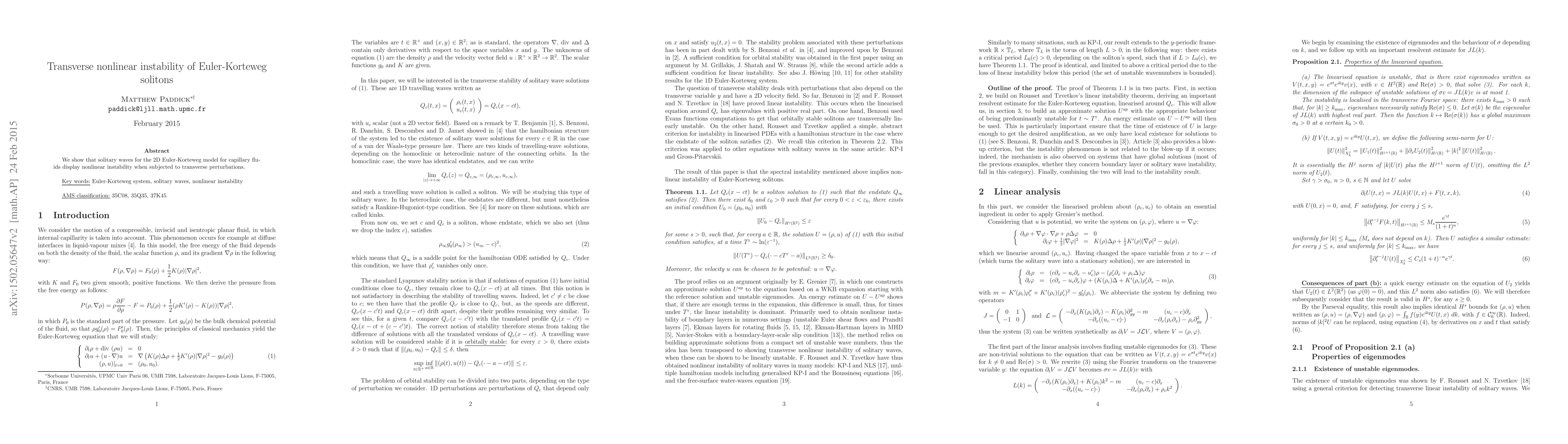 Summary: This study reveals that solitary waves in the 2D Euler-Korteweg model for capillary fluids exhibit nonlinear instability when exposed to transverse perturbations, challenging their stability.
