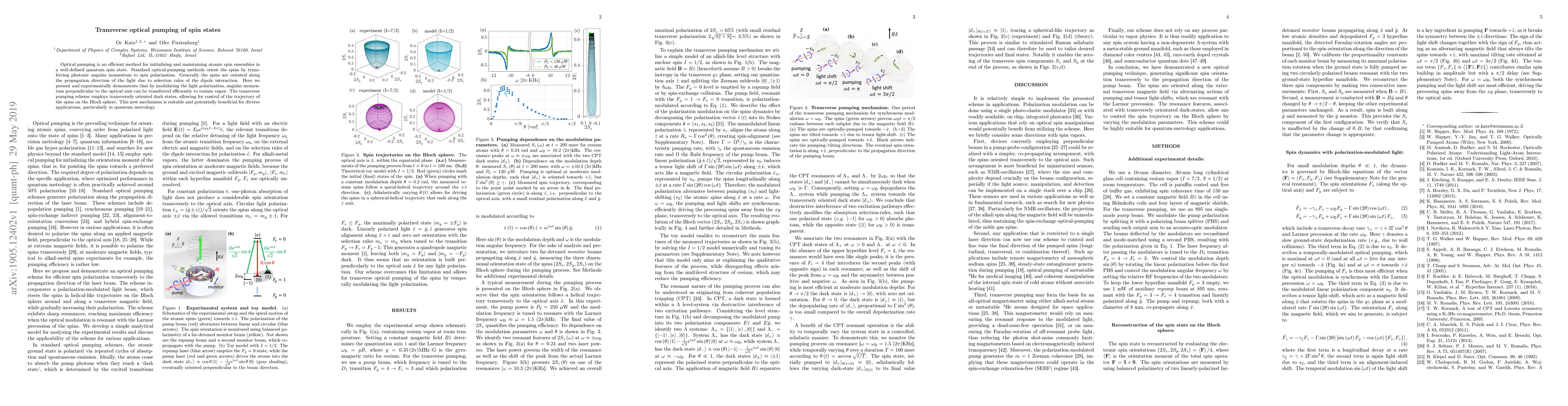 Optical pumping is an efficient method for initializing and maintaining atomic spin ensembles in a well-defined quantum spin state. Standard optical-pumping methods orient the spins by transferring photonic angular momentum to spin polarization. Generally the spins are oriented along the propagation direction of the light due to selection rules of the dipole interaction. Here we present and experimentally demonstrate that by modulating the light polarization, angular momentum perpendicular to the optical axis can be transferred efficiently to cesium vapor. The transverse pumping scheme employs transversely oriented dark states, allowing for control of the trajectory of the spins on the Bloch sphere. This new mechanism is suitable and potentially beneficial for diverse applications, particularly in quantum metrology.