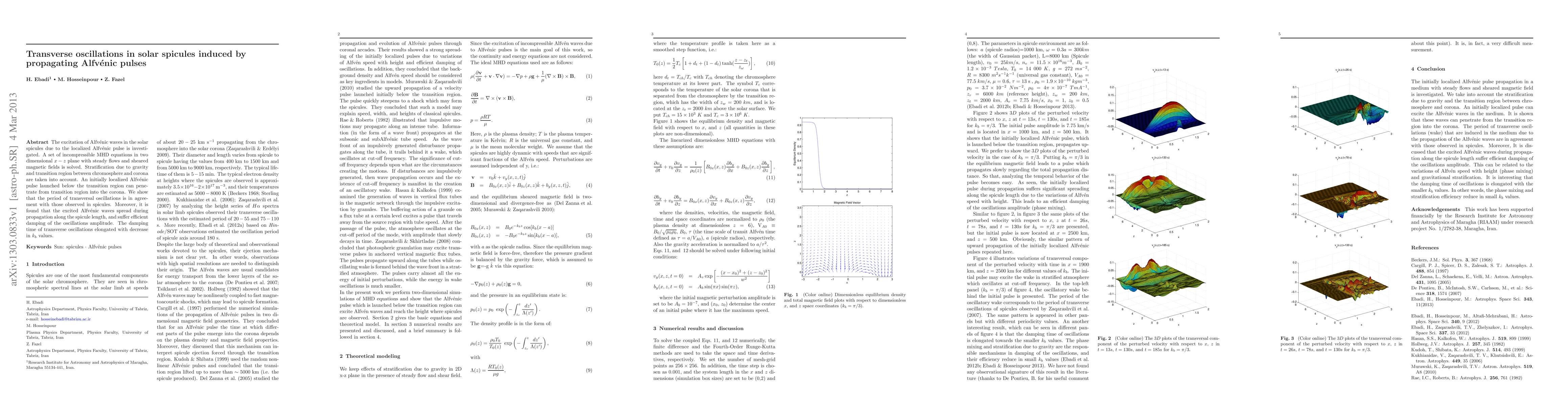 This study investigates Alfvenic waves in solar spicules, showing that localized Alfvenic pulses can induce transverse oscillations with periods matching observations. The waves propagate and dampen along the spicule, with damping time decreasing as wavevector values decrease.