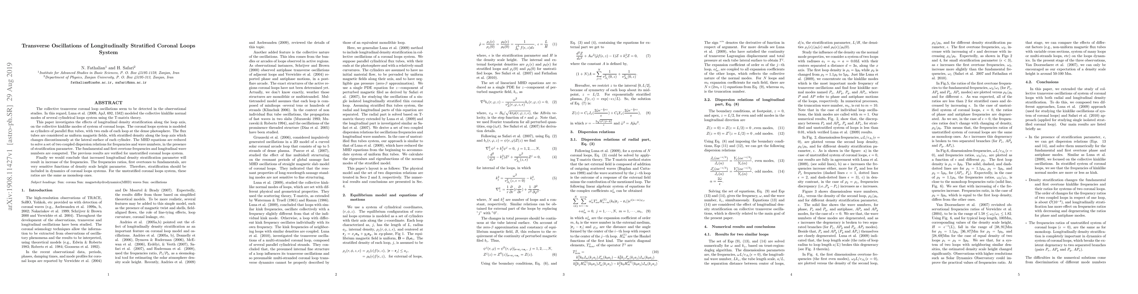 The collective transverse coronal loop oscillations seem to be detected in the observational studies. In this regard, Luna et al. (2009, ApJ, 692, 1582) modeled the collective kinklike normal modes of several cylindrical loops system using the T-matrix theory. This paper investigates the effects of longitudinal density stratification along the loop axis, on the collective kinklike modes of system of coronal loops. The coronal loops system is modeled as cylinders of parallel flux tubes, with two ends of each loop at the dense photosphere. The flux tubes are considered as uniform magnetic fields, with stratified density along the loop axis which changes discontinuously at the lateral surface of each cylinder. The MHD equations are reduced to solve a set of two coupled dispersion relations for frequencies and wave numbers, in the presence of stratification parameter. The fundamental and first overtone frequencies and longitudinal wave numbers are computed. The previous results are verified for unstratified coronal loops system. Finally we would conclude that increased longitudinal density stratification parameter will result in increase of the frequencies. The frequencies ratios, first overtones to fundamentals, are very sensitive functions of density scale height parameter. Therefore, stratification should be included in dynamics of coronal loops systems. For the unstratified coronal loops system, these ratios are the same as monoloop ones.