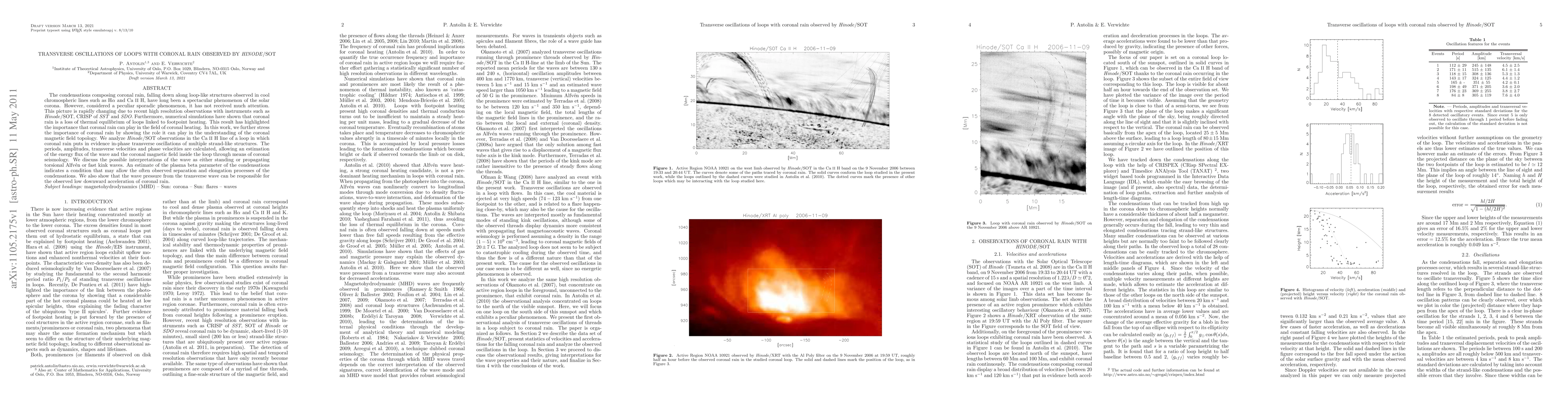 This study uses Hinode/SOT observations to analyze transverse oscillations in coronal rain loops, revealing in-phase oscillations of strand-like structures. The analysis estimates wave energy flux and coronal magnetic field, suggesting Alfv\'en or fast kink waves, and discusses their implications for coronal heating and magnetic field topology.