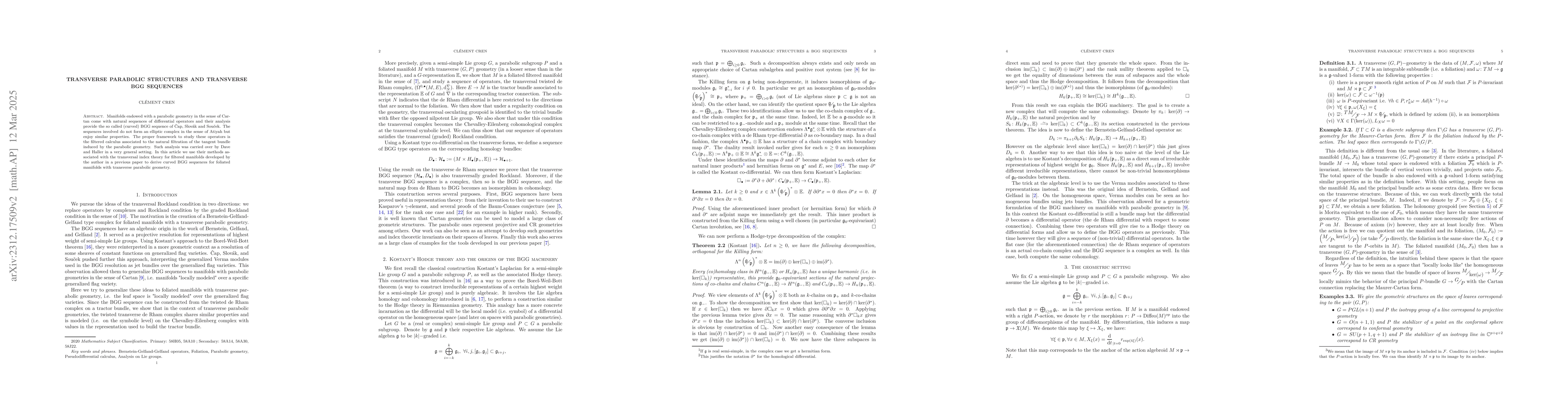 Manifolds endowed with a parabolic geometry in the sense of Cartan come with natural sequences of differential operators and their analysis provide the so called (curved) BGG sequence of {\v C}ap, Slov{\'a}k and Sou{\v c}ek. The sequences involved do not form an elliptic complex in the sense of Atiyah but enjoy similar properties. The proper framework to study these operators is the filtered calculus associated to the natural filtration of the tangent bundle induced by the parabolic geometry. Such analysis was carried over by Dave and Haller in a very general setting. In this article we use their methods associated with the transversal index theory for filtered manifolds developped by the author in a previous paper to derive curved BGG sequences for foliated manifolds with transverse parabolic geometry.