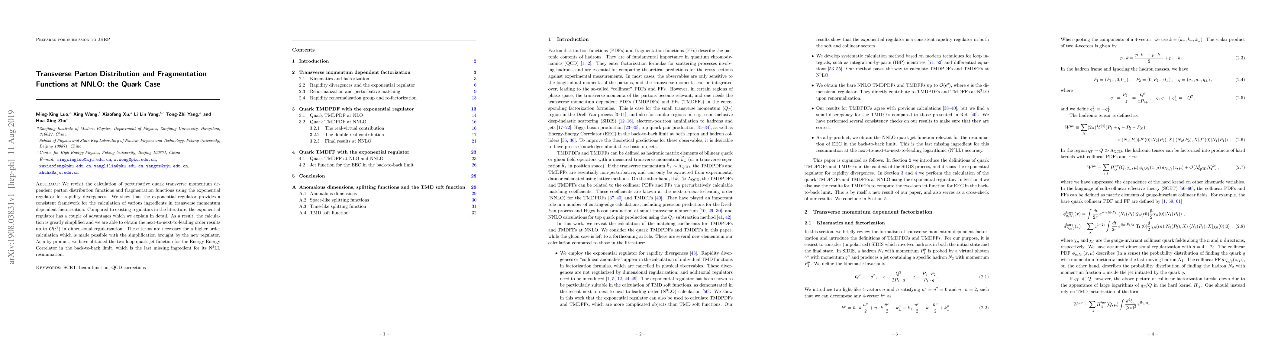 This paper revisits the calculation of quark transverse momentum dependent parton distribution and fragmentation functions using an exponential regulator, simplifying the process and enabling next-to-next-to-leading order results. The new regulator provides advantages over existing methods, facilitating higher order calculations and yielding the two-loop quark jet function for N$^3$LL resummation.