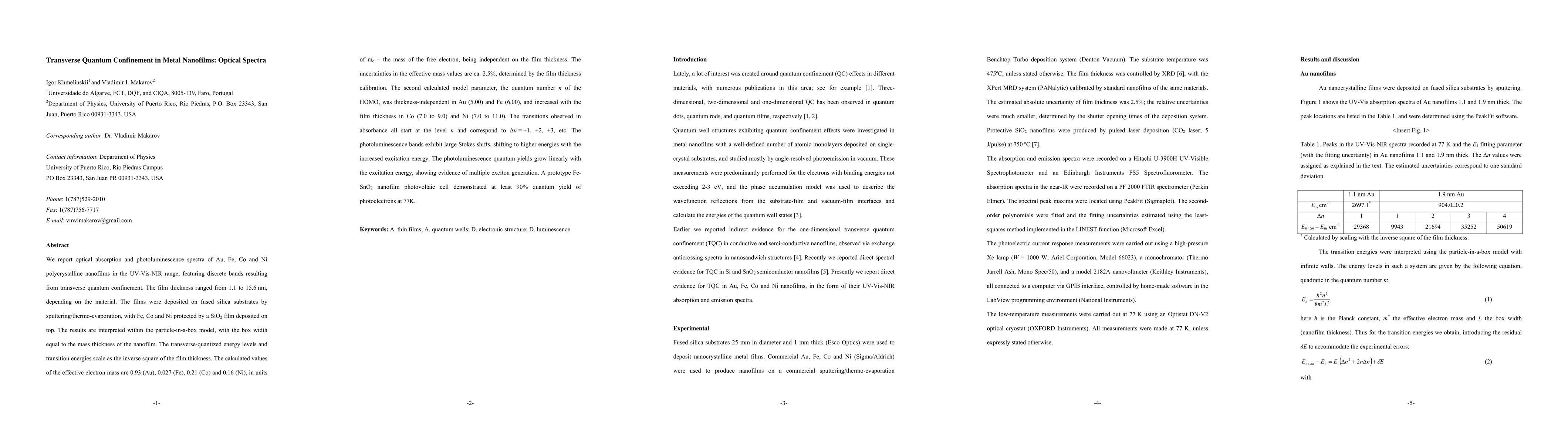 We report optical absorption and photoluminescence spectra of Au, Fe, Co and Ni polycrystalline nanofilms in the UV-Vis-NIR range, featuring discrete bands resulting from transverse quantum confinement. The film thickness ranged from 1.1 to 15.6 nm, depending on the material. The films were deposited on fused silica substrates by sputtering and thermo-evaporation, with Fe, Co and Ni protected by a SiO2 film deposited on top. The results are interpreted within the particle-in-a-box model, with the box width equal to the mass thickness of the nanofilm. The transverse-quantized energy levels and transition energies scale as the inverse square of the film thickness. The calculated values of the effective electron mass are 0.93 (Au), 0.027 (Fe), 0.21 (Co) and 0.16 (Ni), in units of the mass of the free electron, being independent on the film thickness. The uncertainties in the effective mass values are ca. 2.5%, determined by the film thickness calibration. The second calculated model parameter, the quantum number n of the HOMO, was thickness-independent in Au (5) and Fe (6), and increased with the film thickness in Co (from 7 to 9) and Ni (from 7 to 11). The transitions observed in absorbance all start at the level n and correspond to {\Delta}n = +1, +2, +3, etc. The photoluminescence bands exhibit large Stokes shifts, shifting to higher energies with the increased excitation energy. The photoluminescence quantum yields grow linearly with the excitation energy, showing evidence of multiple exciton generation. A prototype Fe-SnO2 nanofilm photovoltaic cell demonstrated at least 90% quantum yield of photoelectrons at 77K.
