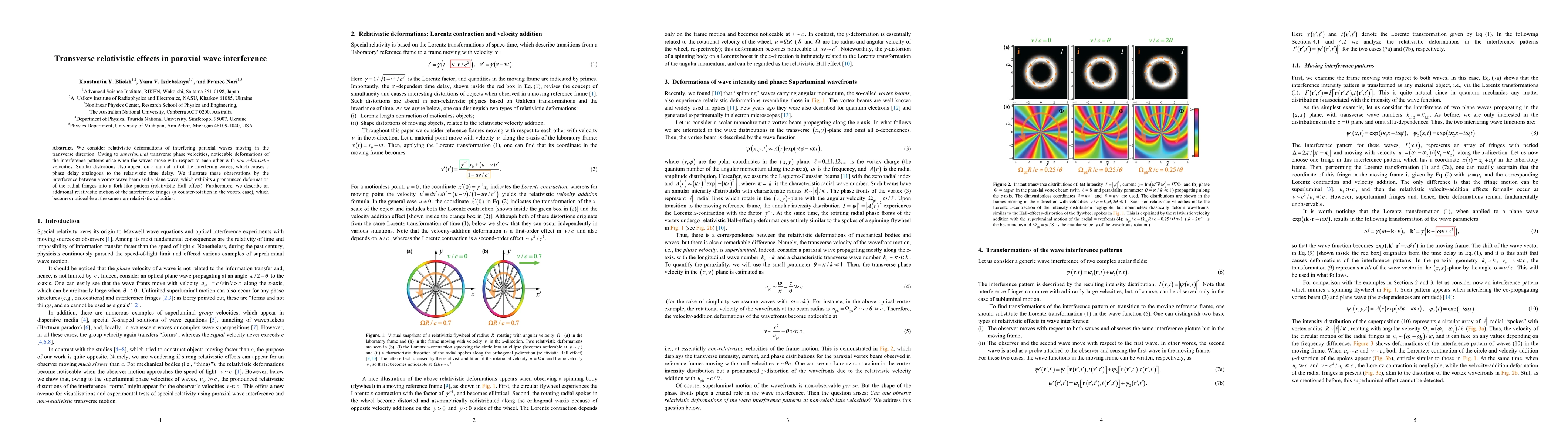 This paper investigates relativistic effects on the interference patterns of paraxial waves moving transversely, revealing significant deformations due to superluminal phase velocities, even at non-relativistic speeds. The study highlights a pronounced "relativistic Hall effect" and counter-rotation of interference fringes in a vortex wave beam, demonstrating these phenomena through the interference between a vortex wave and a plane wave.