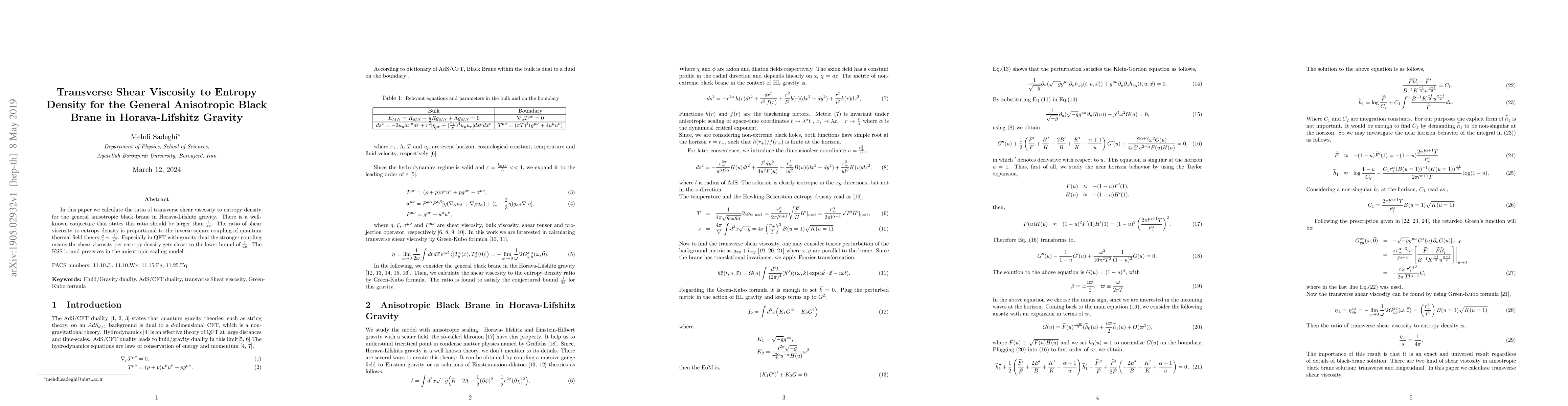 In this paper we calculate the ratio of transverse shear viscosity to entropy density for the general anisotropic black brane in Horava-Lifshitz gravity. There is a well-known conjecture that states this ratio should be larger than $\frac{1}{4\pi}$. The ratio of shear viscosity to entropy density is proportional to the inverse square coupling of quantum thermal field theory,$\frac{\eta }{s} \sim \frac{1}{\lambda^2 }$. Especially in QFT with gravity dual the stronger coupling means the shear viscosity per entropy density gets closer to the lower bound of $\frac{1}{4\pi}$. The KSS bound preserves in the anisotropic scaling model.