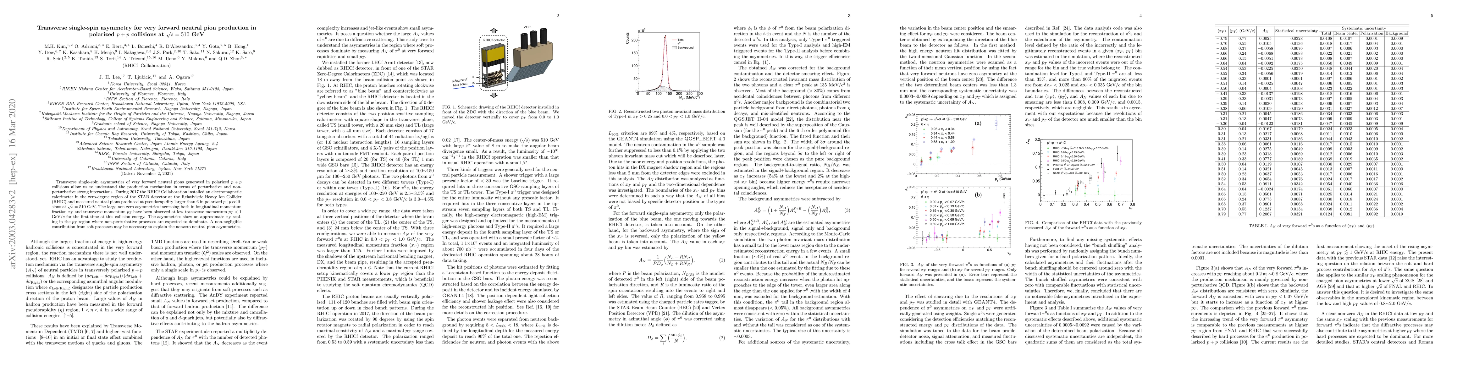 Transverse single-spin asymmetries of very forward neutral pions generated in polarized $p + p$ collisions allow us to understand the production mechanism in terms of perturbative and non-perturbative strong interactions. During 2017 the RHICf Collaboration installed an electromagnetic calorimeter in the zero-degree region of the STAR detector at the Relativistic Heavy Ion Collider (RHIC) and measured neutral pions produced at pseudorapidity larger than 6 in polarized $p$+$p$ collisions at $\sqrt{s}$ = 510 GeV. The large non-zero asymmetries increasing both in longitudinal momentum fraction $x_{F}$ and transverse momentum $p_{T}$ have been observed at low transverse momentum $p_{T} < 1$ GeV/$c$ for the first time at this collision energy. The asymmetries show an approximate $x_{F}$ scaling in the $p_{T}$ region where non-perturbative processes are expected to dominate. A non-negligible contribution from soft processes may be necessary to explain the nonzero neutral pion asymmetries.