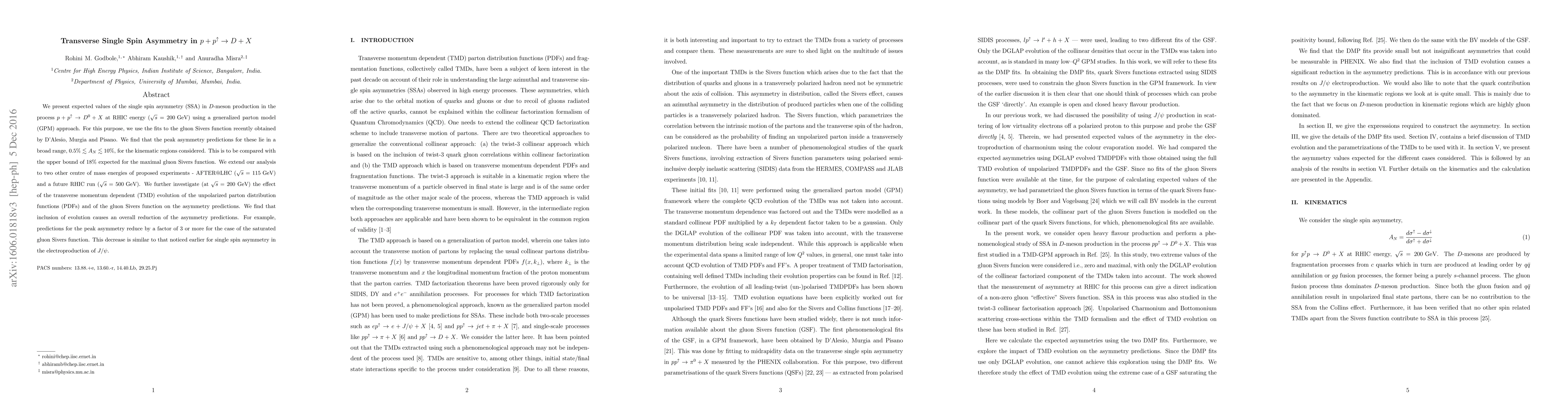 We present expected values of the Single Spin Asymmetry (SSA) in $D$-meson production in the process $p+p^\uparrow \rightarrow D^0 + X $ at RHIC energy $(\sqrt{s}=200\text{ GeV})$ using a generalized parton model approach. We use fits to the gluon Sivers function obtained recently by D'Alesio {\it et al.,} by fitting to the asymmetry data for the process $p+p^\uparrow \rightarrow \pi^0+ X$ measured by the PHENIX collaboration at RHIC. These fits give peak asymmetry predictions which lie in a broad range, $0.5\%\lesssim A_N\lesssim10\%$ for the kinematic regions considered. This is to be compared with the upper bound of 18\% expected for the maximal gluon Sivers function. We extend our analysis to two other centre of mass energies of proposed experiments - AFTER@LHC $(\sqrt{s}=115\text{ GeV})$ and a future RHIC run $(\sqrt{s}=500\text{ GeV})$. We further investigate (at $\sqrt{s}=200$ GeV) the effect of the transverse momentum dependent (TMD) evolution of the unpolarized parton distribution functions (pdf's) and of the gluon Sivers function on the asymmetry predictions. We perform this study using an evolution setup given by Anselmino {\it et al}. We find that the effect of evolution is an overall reduction of the asymmetry predictions. For example, for the saturated gluon Sivers function, upon taking into account TMD evolution, peak asymmetry predictions reduce by a factor 3 or more. This decrease is similar to that noticed earlier for Single Spin Asymmetries (SSA) in the electroproduction of $J/\psi$.