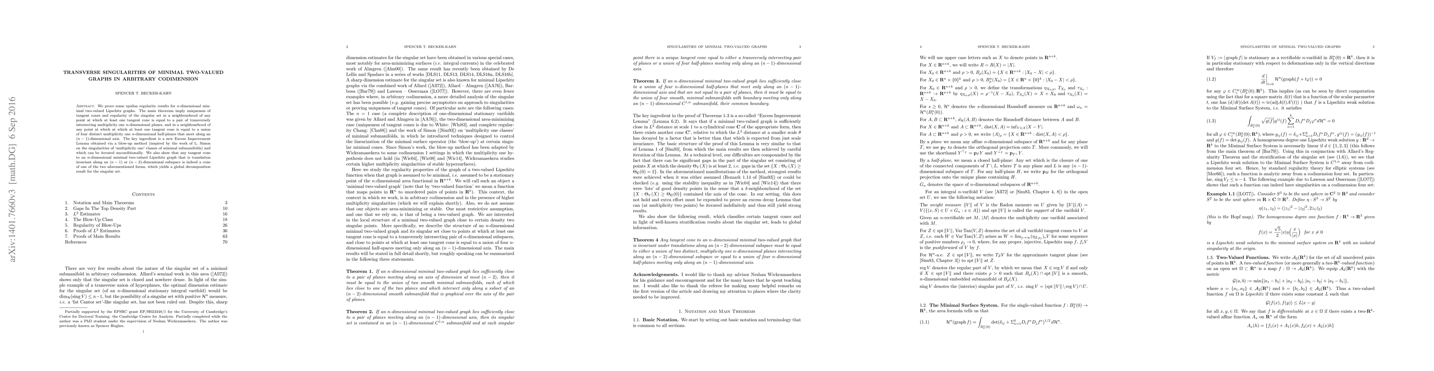 Researchers prove epsilon regularity results for n-dimensional minimal two-valued Lipschitz graphs, showing uniqueness of tangent cones and regularity of singular sets in specific configurations, with implications for global decomposition of the singular set.