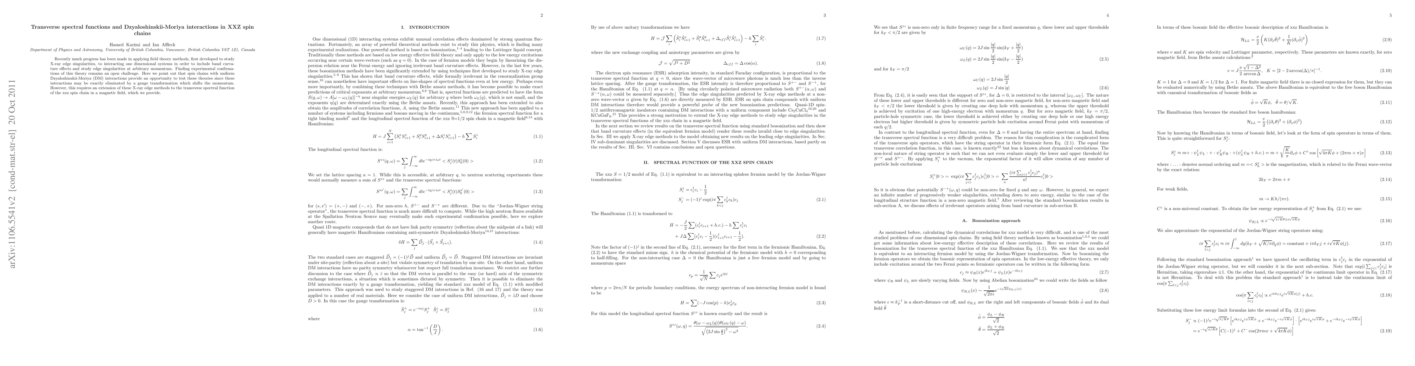 This paper extends field theory methods to study the transverse spectral functions in XXZ spin chains with Dzyaloshinskii-Moriya interactions, providing a theoretical framework to test these methods experimentally. The exact elimination of DM interactions via a gauge transformation is highlighted as a key aspect for this analysis.