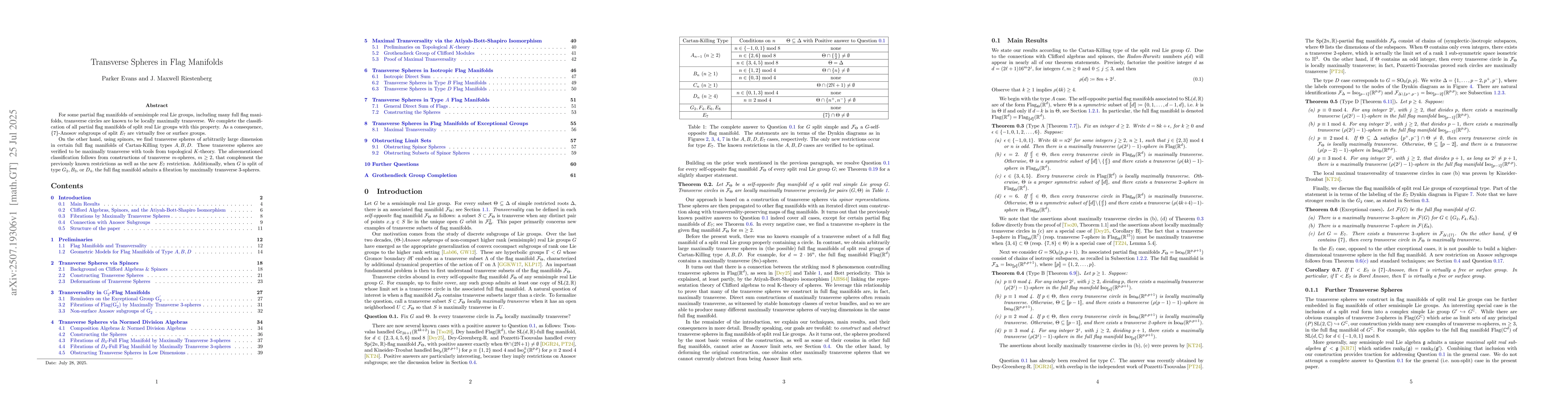 For some partial flag manifolds of semisimple real Lie groups, including many full flag manifolds, transverse circles are known to be locally maximally transverse. We complete the classification of all partial flag manifolds of split real Lie groups with this property. As a consequence, $\{7\}$-Anosov subgroups of split $E_7$ are virtually free or surface groups. On the other hand, using spinors, we find transverse spheres of arbitrarily large dimension in certain full flag manifolds of Cartan-Killing types $A,B,D$. These transverse spheres are verified to be maximally transverse with tools from topological $K$-theory. The aforementioned classification follows from constructions of transverse $m$-spheres, $m \geq 2$, that complement the previously known restrictions as well as the new $E_7$ restriction. Additionally, when $G$ is split of type $G_2, B_3,$ or $D_4$, the full flag manifold admits a fibration by maximally transverse 3-spheres.
