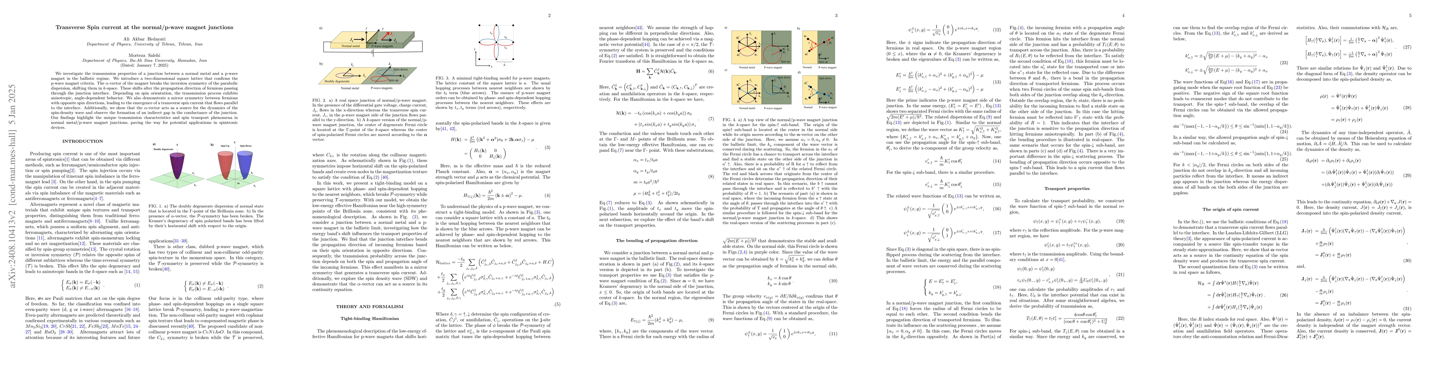 We investigate the transmission properties of a junction between a normal metal and a p-wave altermagnet in the ballistic regime. We introduce a two-dimensional square lattice that confirms the p-wave altermagnet criteria. The $\alpha$-vector of the altermagnet breaks the inversion symmetry of the parabolic dispersion, shifting them in k-space. These shifts alter the propagation direction of fermions passing through the junction interface. Depending on spin orientation, the transmission process exhibits anisotropic, angle-dependent behavior. We also demonstrate a mirror symmetry between fermions with opposite spin directions, leading to the emergence of a transverse spin current that flows parallel to the interface. Additionally, we show that the $\alpha$-vector acts as a source for the dynamics of the spin-density wave and observe the formation of an indirect gap in the conductance of the junction. Our findings highlight the unique transmission characteristics and spin transport phenomena in normal metal/p-wave altermagnet junctions, paving the way for potential applications in spintronic devices.