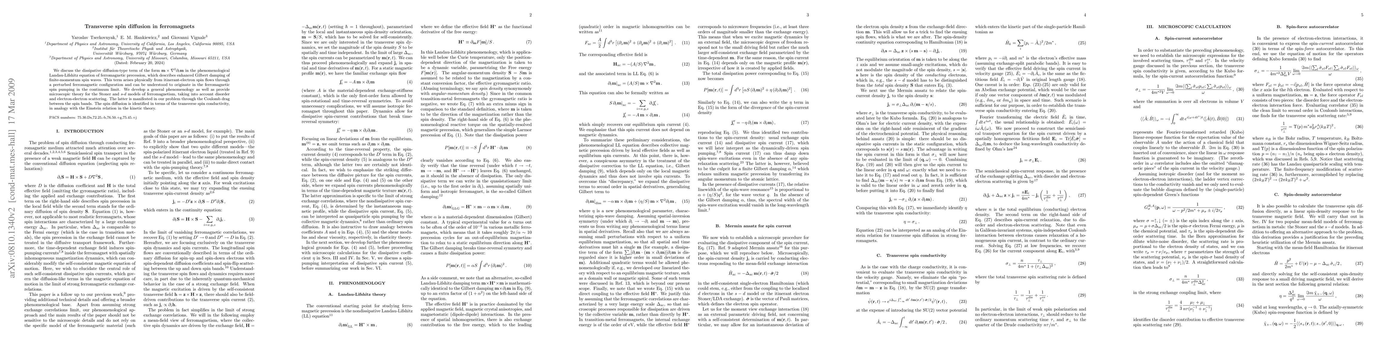 We discuss the dissipative diffusion-type term of the form $\mathbf{m}\times\nabla^2\partial_t\mathbf{m}$ in the phenomenological Landau-Lifshitz equation of ferromagnetic precession, which describes enhanced Gilbert damping of finite-momentum spin waves. This term arises physically from itinerant-electron spin flows through a perturbed ferromagnetic configuration and can be understood to originate in the ferromagnetic spin pumping in the continuum limit. We develop a general phenomenology as well as provide microscopic theory for the Stoner and s-d models of ferromagnetism, taking into account disorder and electron-electron scattering. The latter is manifested in our problem through the Coulomb drag between the spin bands. The spin diffusion is identified in terms of the transverse spin conductivity, in analogy with the Einstein relation in the kinetic theory.
