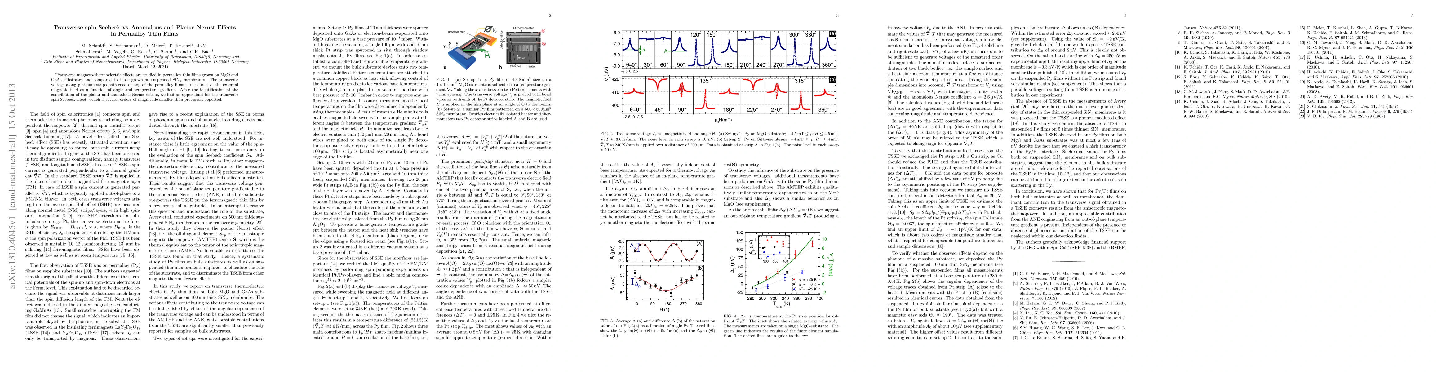 Transverse magneto-thermoelectric effects are studied in permalloy thin films grown on MgO and GaAs substrates and compared to those grown on suspended SiN membranes. The transverse voltage along platinum strips patterned on top of the permalloy films is measured vs. the external magnetic field as a function of angle and temperature gradient. After the identification of the contribution of the planar and anomalous Nernst effects, we find an upper limit for the transverse spin Seebeck effect, which is several orders of magnitude smaller than previously reported.